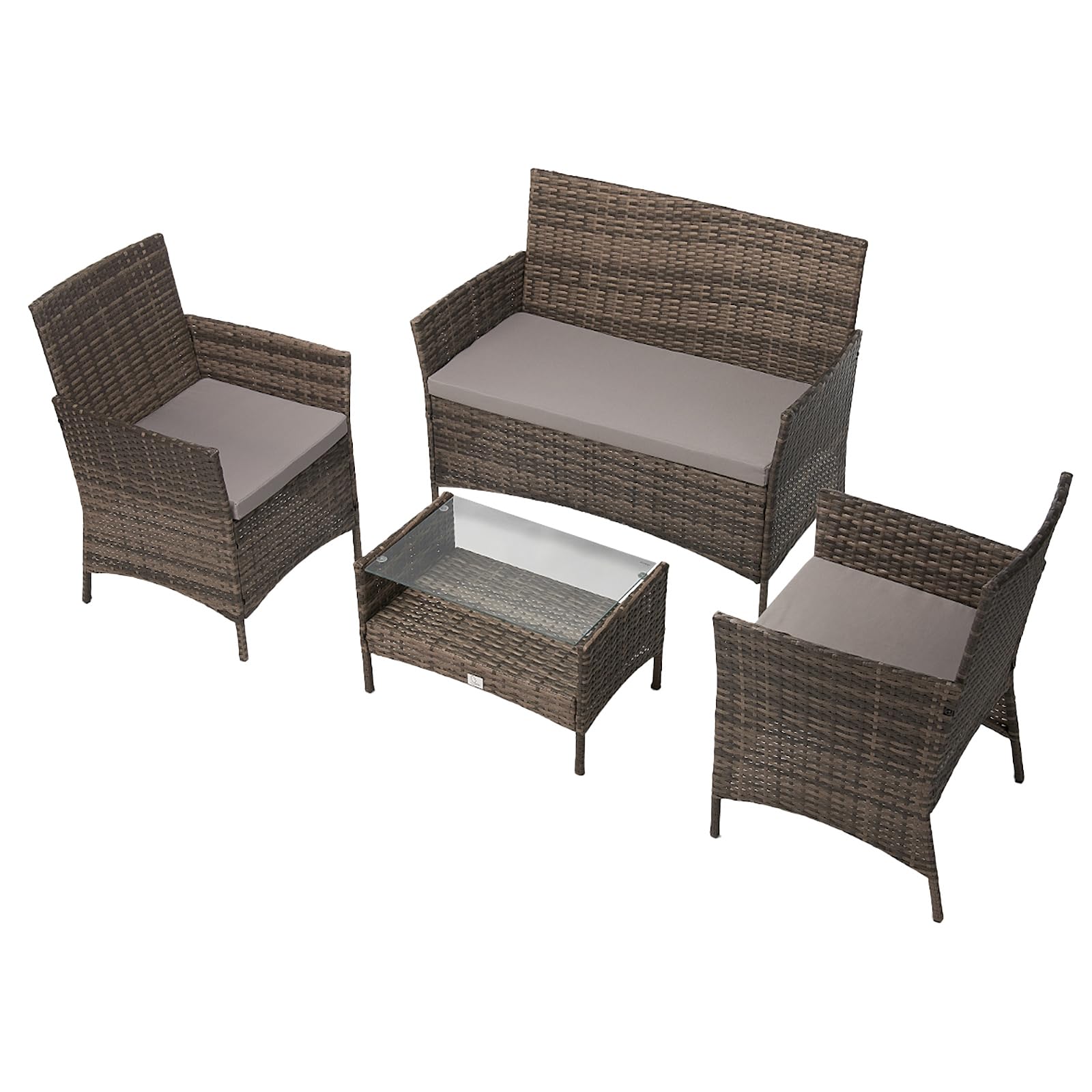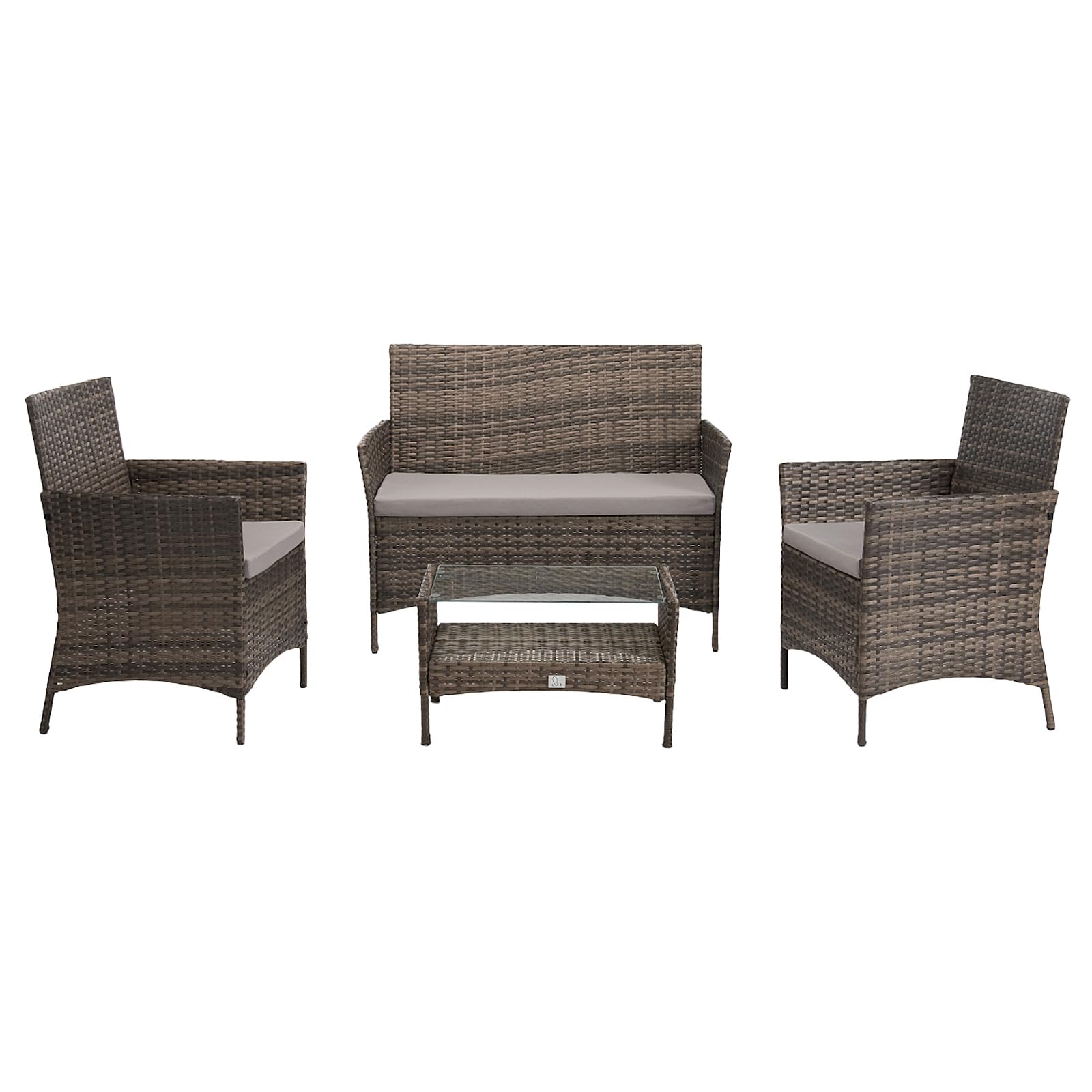 Produktdetails:1 x Tisch mit Glasplatte: ca. 60 x 38 x 36 cm2 x Einzelsessel inkl. Kissen : ca. 57 x 58 x 82 cm 1 x Doppelsofa inkl. Kissen: ca. 106 x 58 x 82 cmFarbe: BraunKissenfarbe: GrauPollyrattan: langlebiges, umempfindliches Material, wetterfest und UV-beständigKissenbezüge aus pflegeleichtem Polyester – mit Reissverschluss, abnehmbar und waschbarGewicht: ca. 25 kg