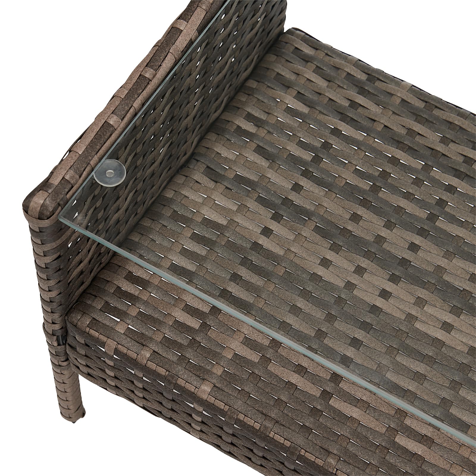 Dieses Möbelset ist ideal für die Nutzung im Freien. Besonders charmant ist der praktische Beistelltisch mit zwei Ablageflächen. Nutzen Sie die Glasplatte um Speisen und Getränke abzustellen, auf der unteren Ebene ist genügend Aufbewahrungsmöglichkeit für Zeitschriften, Bücher & Co.