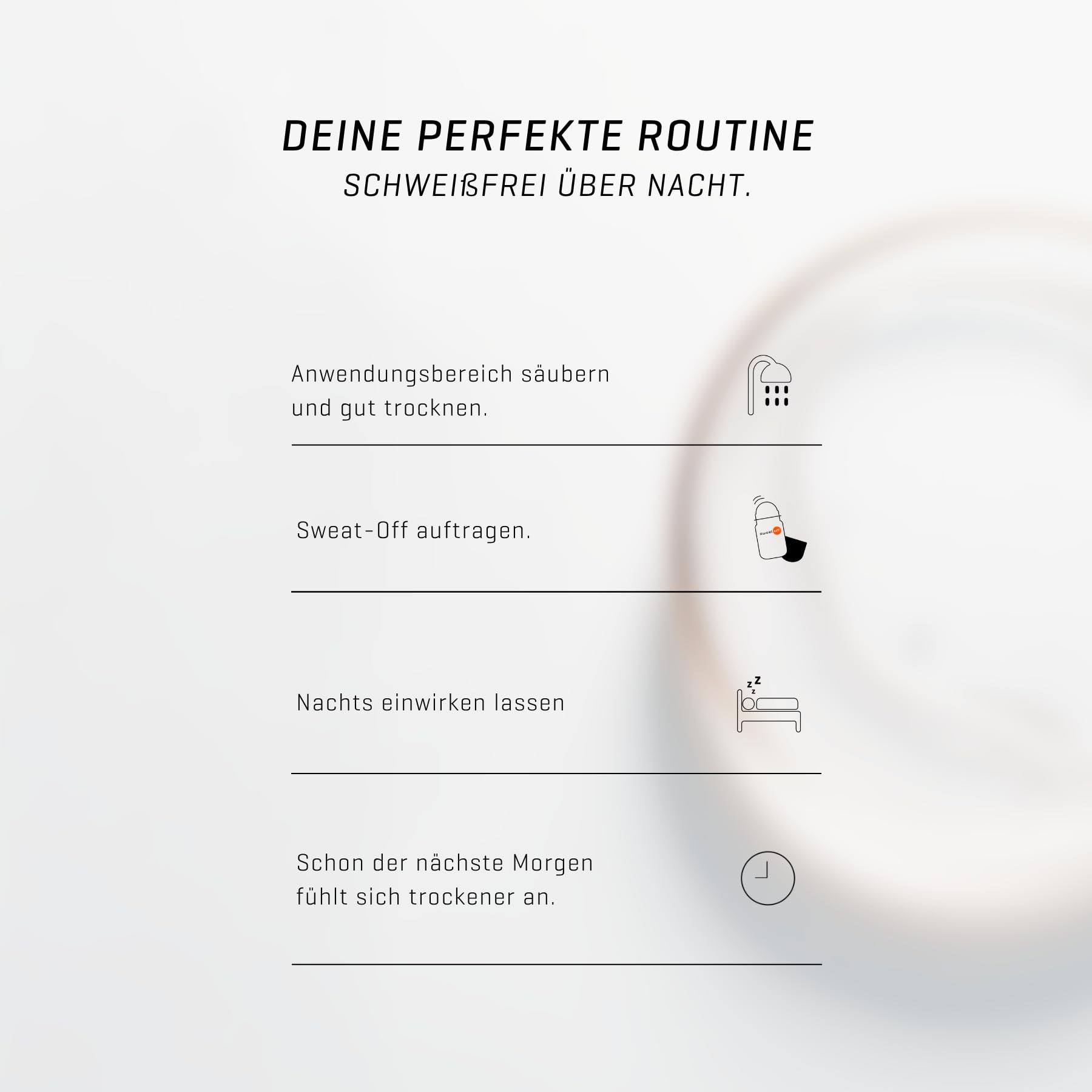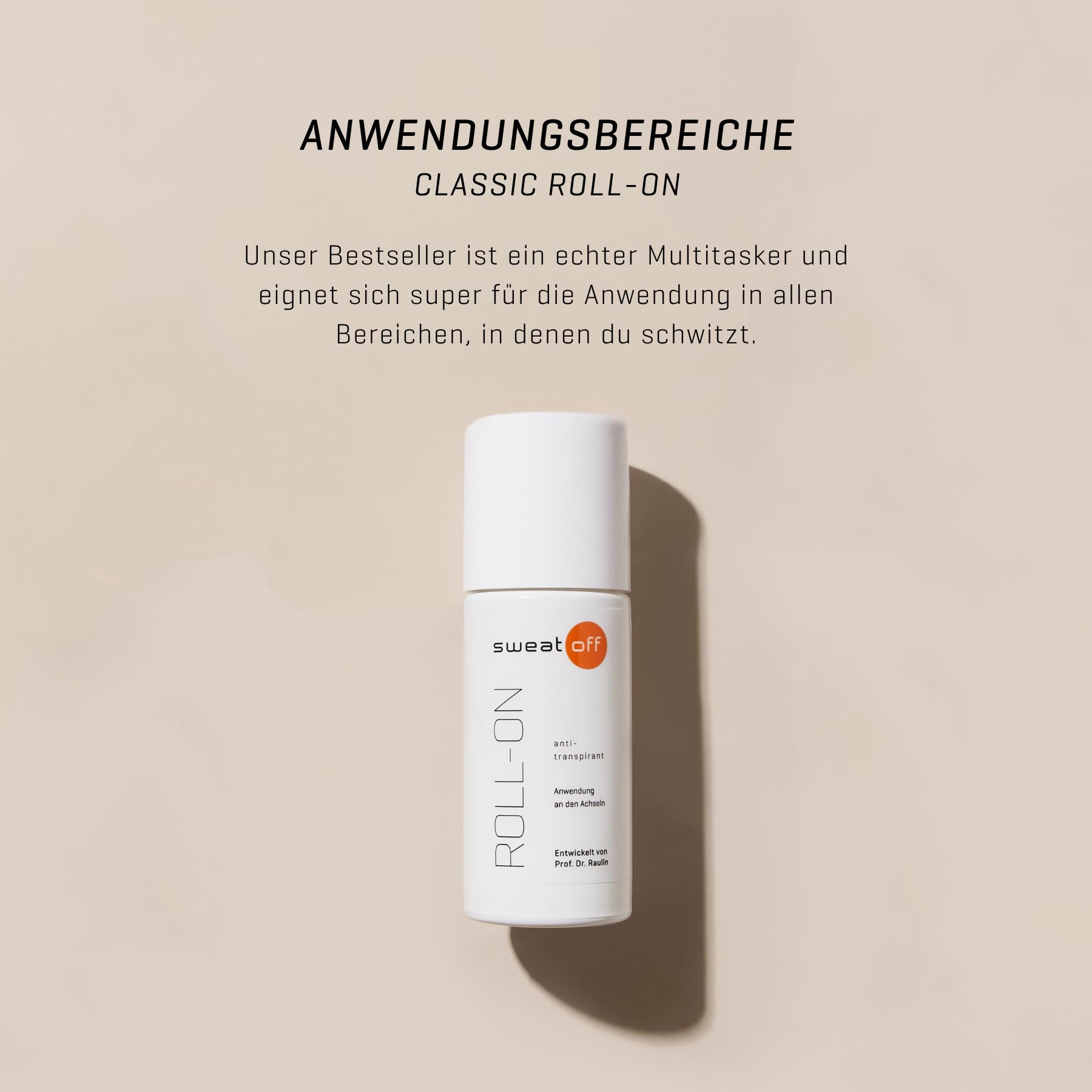 Sweat-Off Roll-On ist ein extra starkes Antitranspirant gegen starkes Schwitzen und Geruch, entwickelt fuer Achseln und zusaetzlich geeignet fuer Haende, Fuesse und weitere Koerperzonen. Die Formulierung basiert auf Aluminium Chloride und ist auf Langzeitwirkung ausgelegt: Eine kleine Menge kann die Schweissbildung tage- oder sogar wochenlang deutlich reduzieren. Dadurch ist der Roll-On sehr ergiebig und wird nach der Einwirkphase nur noch bei Bedarf nachgelegt.