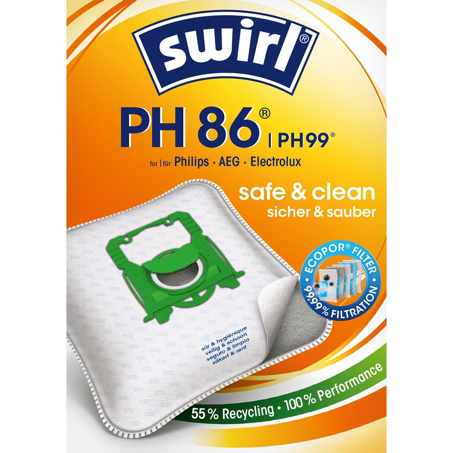 Swirl PH 86 EcoPor Staubsaugerbeutel (10 Beutel), reissfeste Staubbeutel für einige Philips, AEG, Electrolux & Volta Staubsauger, im umweltfreundlichen Umkarton, 99,9% Filterung von Hausstaub