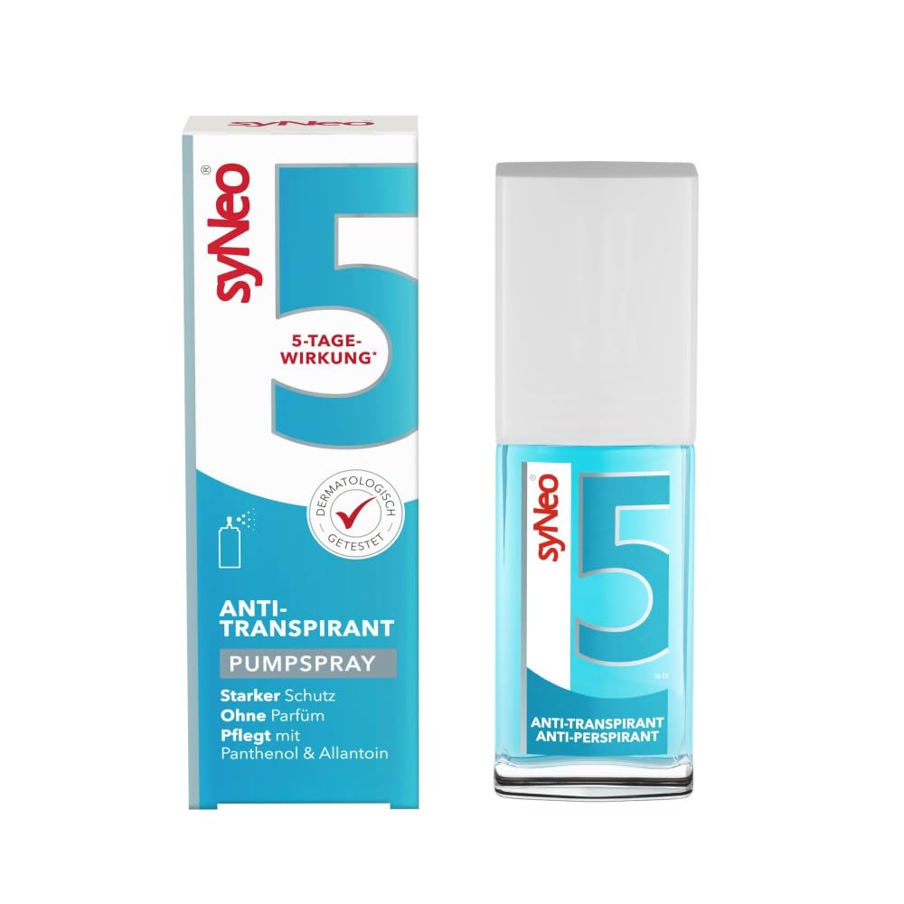 syNeo 5 Antitranspirant Pumpspray ist ein Langzeit-Antitranspirant gegen starkes Schwitzen und Schweissgeruch mit bis zu 5 Tage Wirkung. Die bewaehrte 5-Tage-Formel wirkt oft bereits nach der ersten Anwendung und wurde laut Dermatest mit sehr gut bewertet. Das macht es besonders geeignet fuer Menschen, die einen verlaesslichen Anti Schweiss Schutz suchen, ohne taeglich nachzulegen.