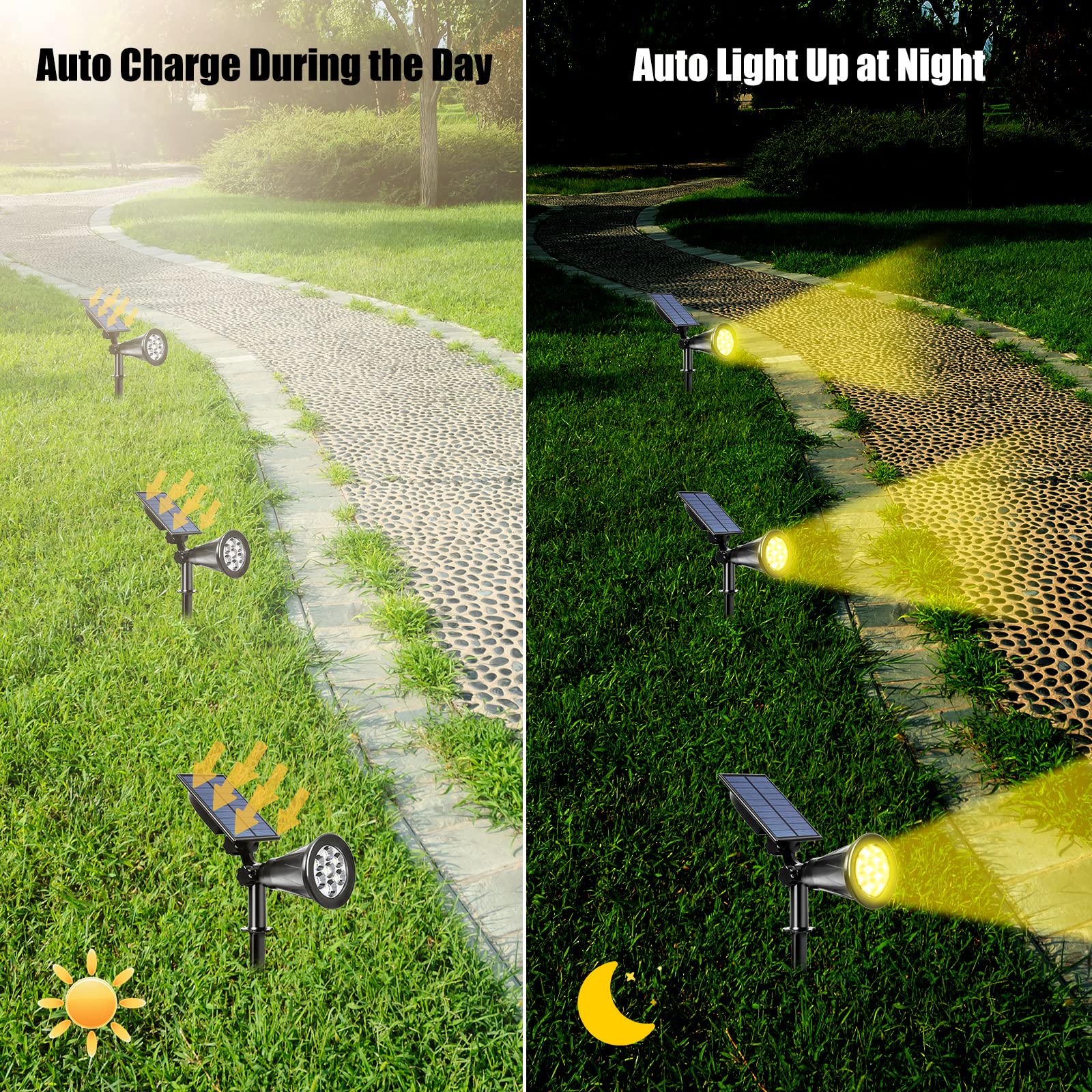 Funktionsweise: Lichtsteuerung, Aufladung der Solarenergie in der integrierten Batterie während des Tages, die Leuchten schalten sich bei Einbruch der Dunkelheit automatisch ein.