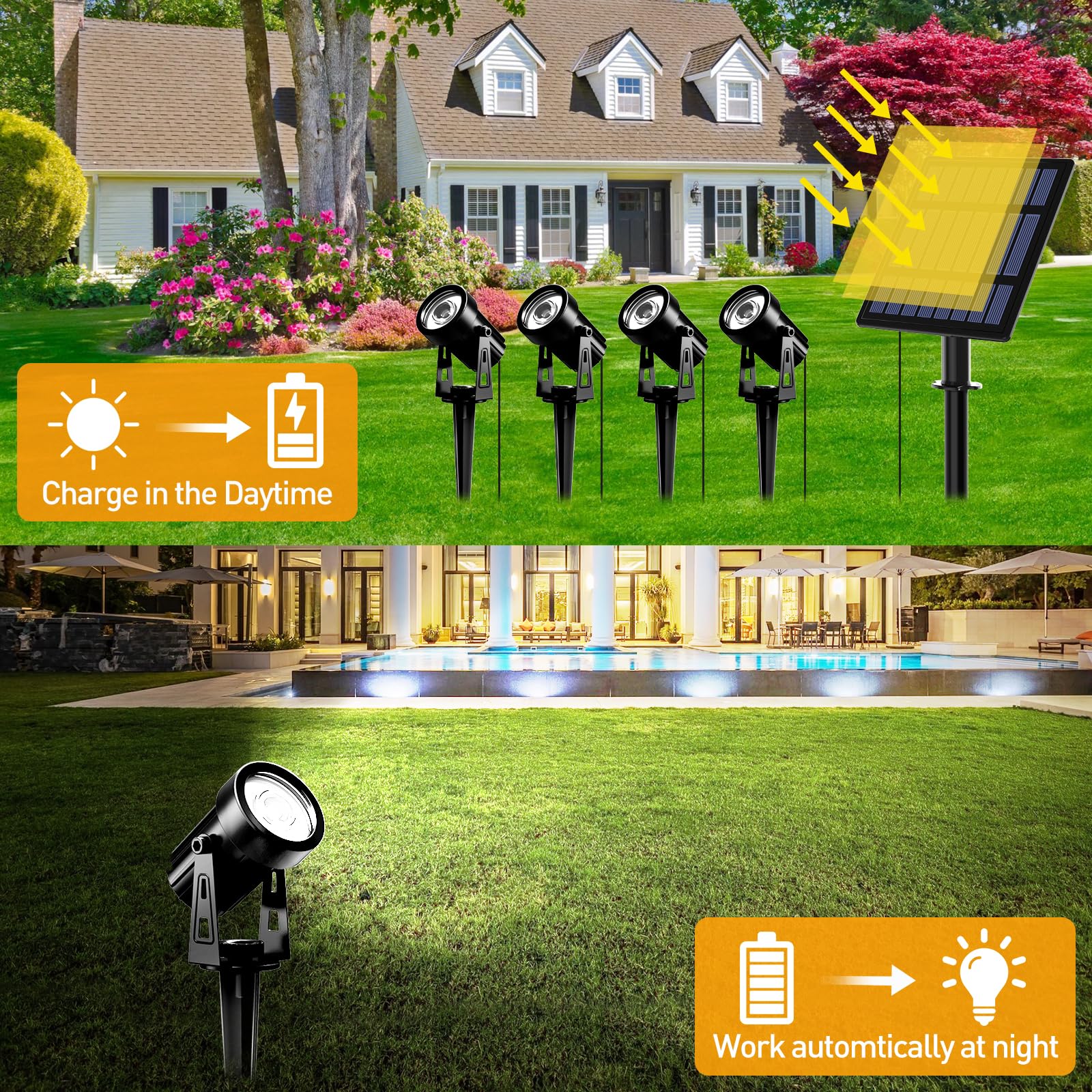 T-SUNUS Gartenstrahler Solar Aussen, 4 Stück Gartenlampe Solar IP65 Wasserdicht Solar Gartenleuchte 3M Kabel Auto On/Off 5W 4000mAh für Garten Auffahrt Weg Pool Weiss 6000K
