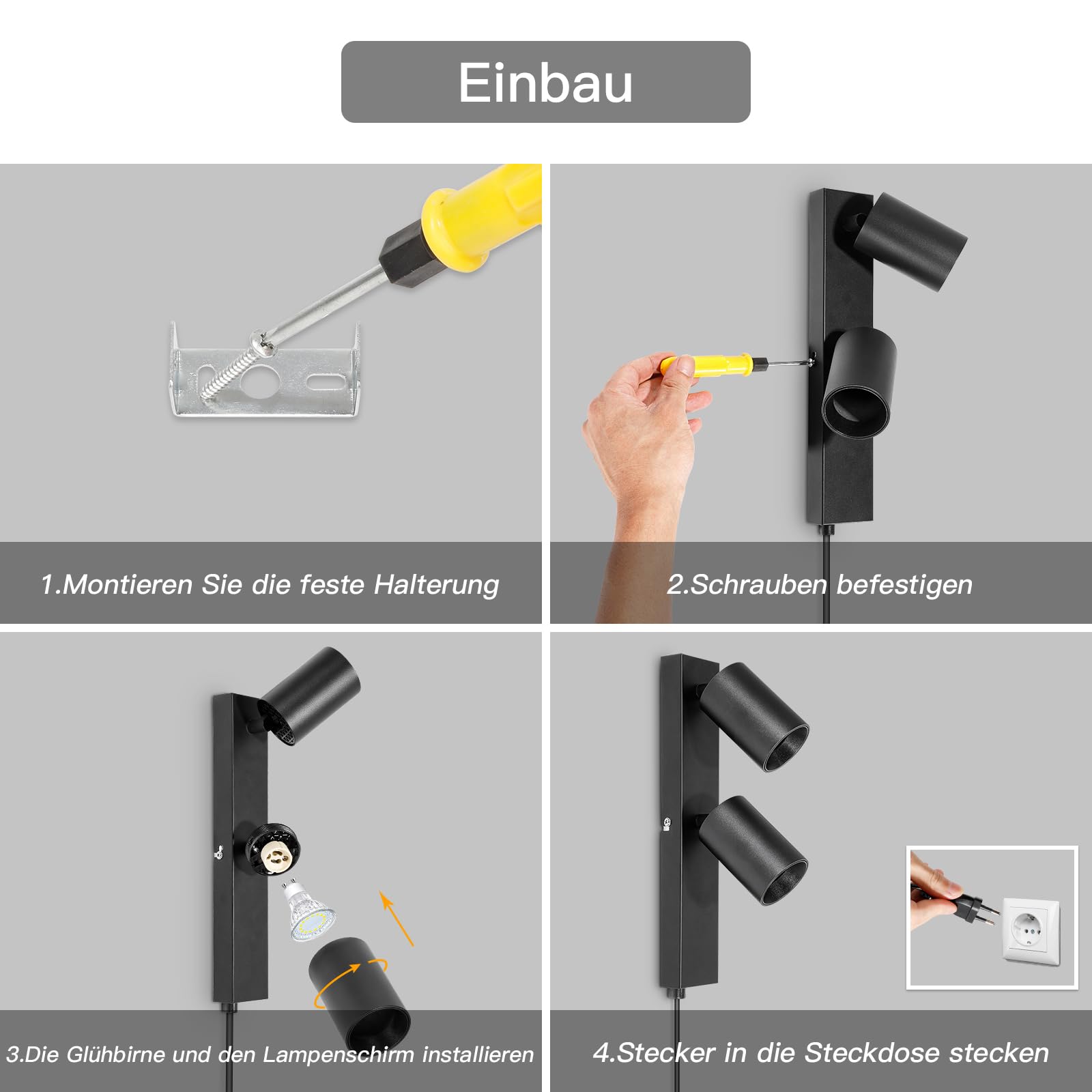 Einzelheiten:Farbe: Schwarz.Material: Aluminium; EisenSpannung: 220-240 V/50 HzMaximale Leistung der einzelnen Leuchte: 7 WattSchutzart: IP20Stil: modernes/industrielles DesignSockel: geeignet für GU10 LED-Lampen (nicht geeignet für Halogenlampen, Lampen und Dimmer nicht enthalten)Grösse:Sockel L**B*H: 30.0cm*5.5cm*2.5cmDurchmesser des Schirms: 8,5cm*5,5cmPaket:Wandleuchte*1; Gebrauchsanweisung*1; MontagezubehörAnwendung:Wandleuchte für Schlafzimmer, Leselicht