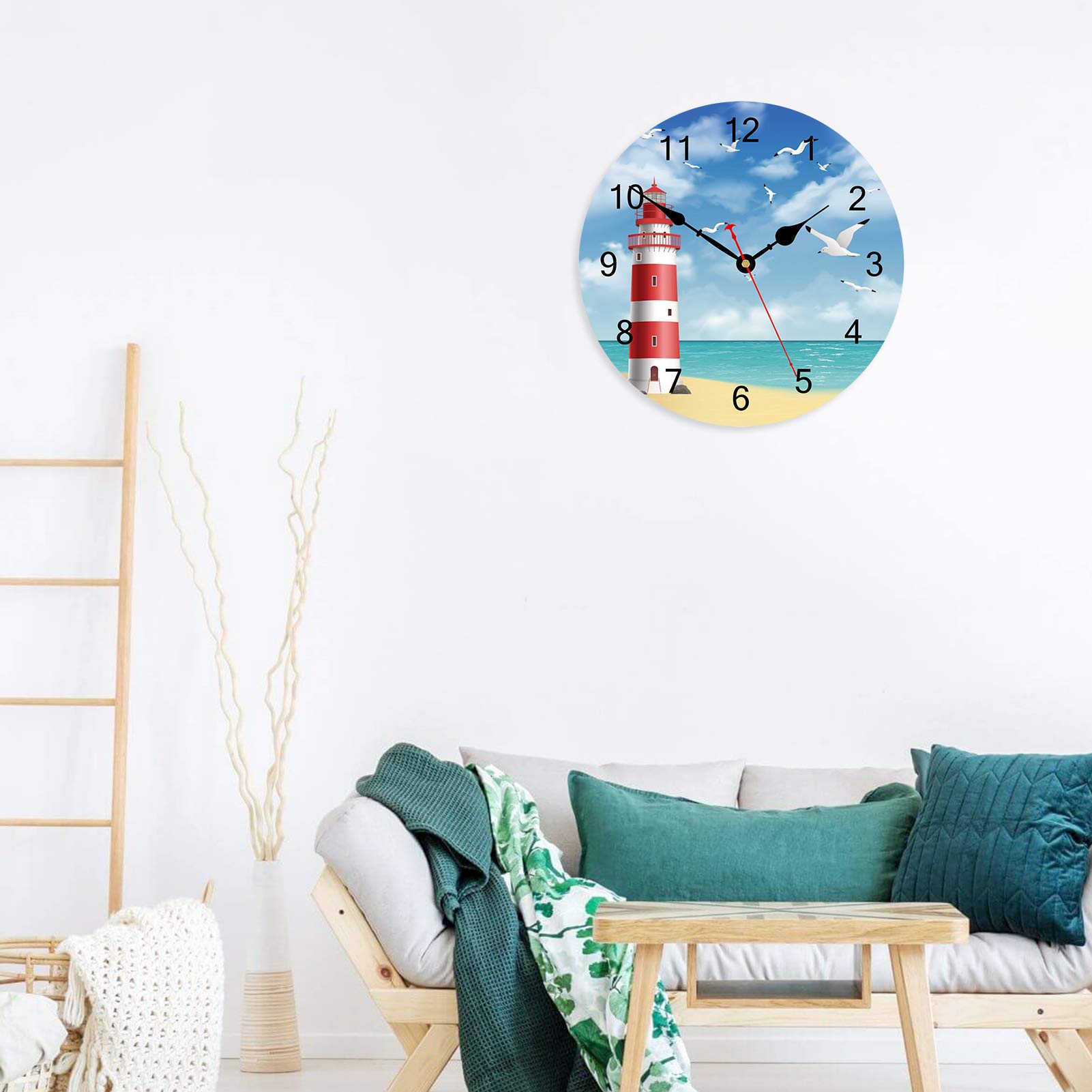 TAHEAT Leuchtturm Möwe Ozean Wanduhr, Hölzern Batteriebetrieben Uhren, Leise Nicht tickend Leicht zu lesen Wanduhr für Küche/Schlafzimmer/Wohnzimmer, 34 cm