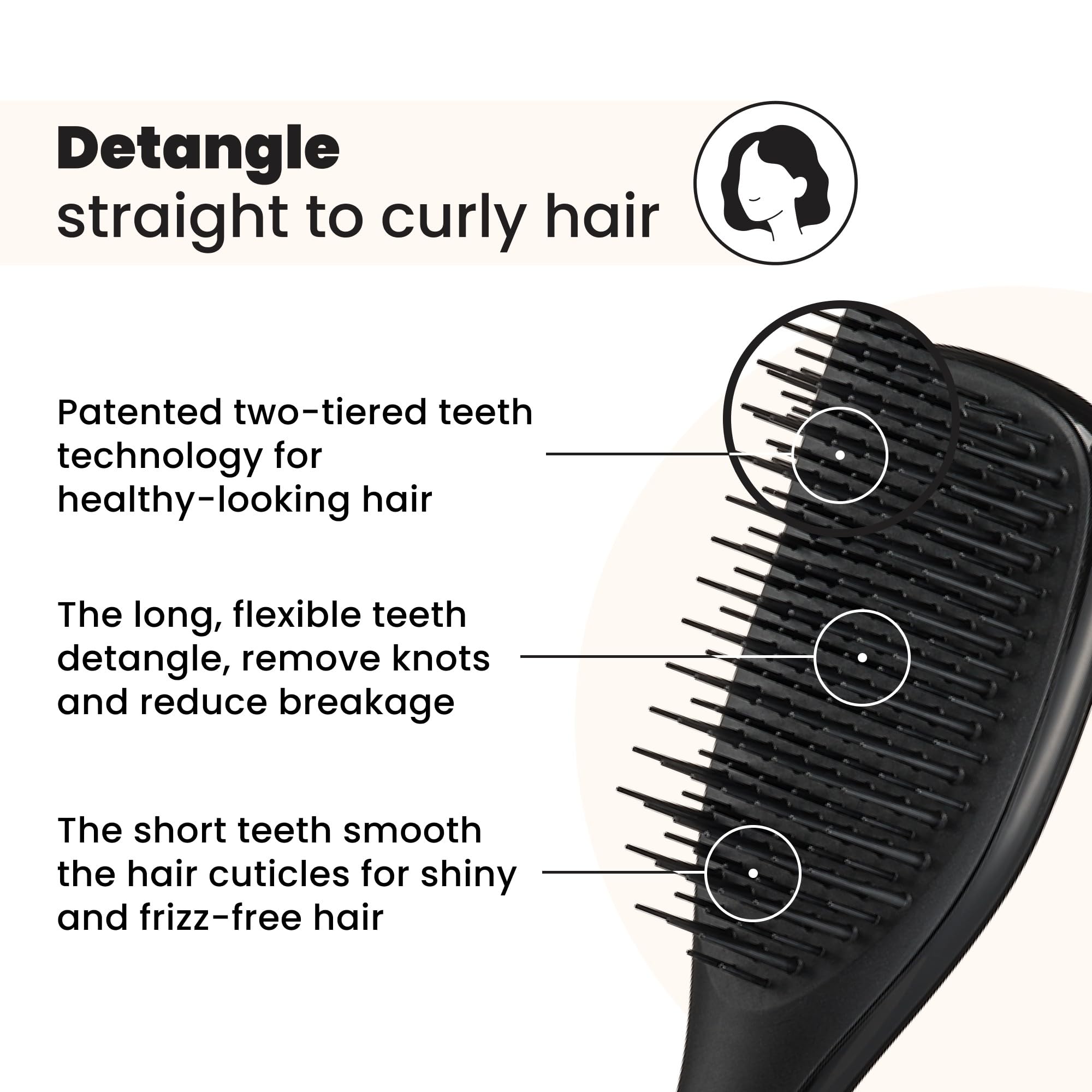Die extra flexiblen, laengeren Borsten gleiten sanft durch das Haar und loesen Knoten und Verfilzungen besonders schonend. Dabei wird Haarbruch reduziert, die Kopfhaut geschuetzt und das Haar bleibt geschmeidig und glaenzend. Besonders beim Entwirren von nassem Haar zeigt die Ultimate Detangler Buerste ihre Staerken.