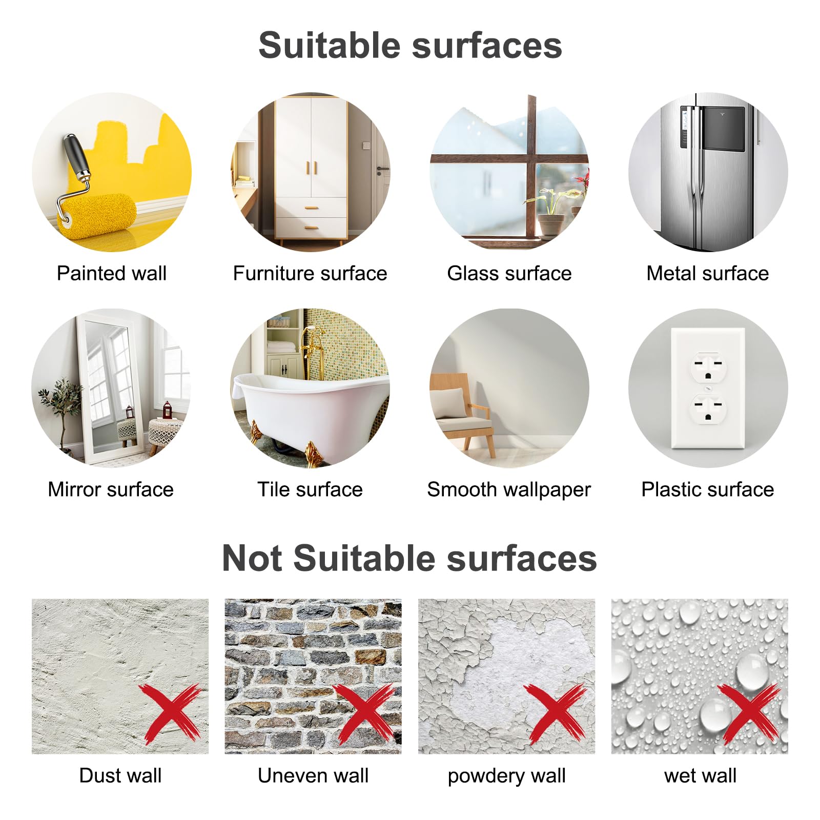 1. Stellen Sie sicher, dass die Oberfläche glatt, trocken, sauber und frei von Staub, Schmutz und Fett ist. Bitte kleben Sie es nicht auf eine unebene Oberfläche, eine Oberfläche mit Löchern oder eine abblätternde Wand.