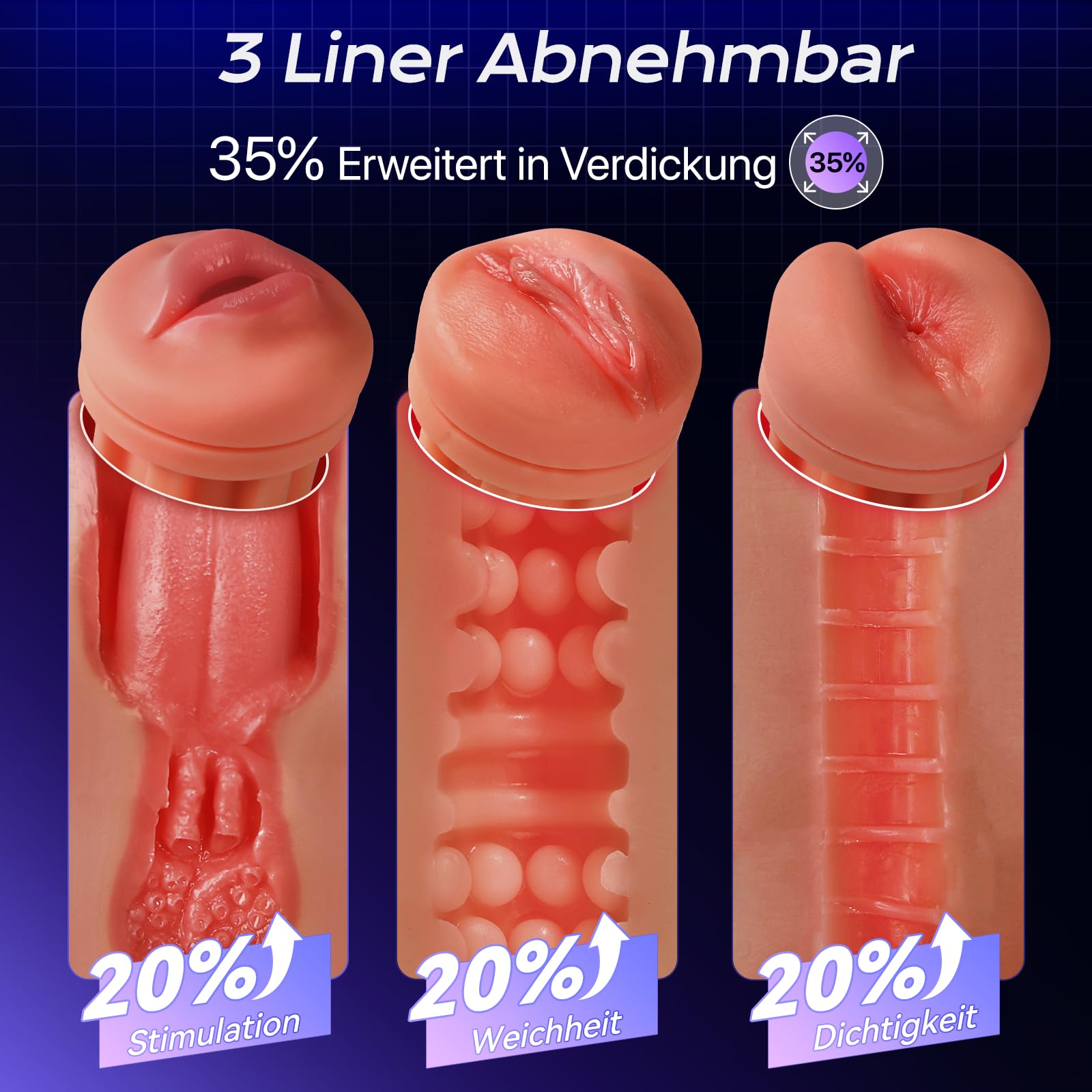 • 3 Abnehmbar Liner: Sex Spielzeug für die Männer mit 3 verschiedenen Liner Sexspielzeug steht aus hochwertigem Silikon mit einer realistischen,weichen Textur, und einfach zu entfernen und zu installieren ist. Mit diesem Masturbieren für Männer handfrei können Sie drei verschiedene Erfahrungen zur gleichen Zeit geniessen Maschinen & Geräte