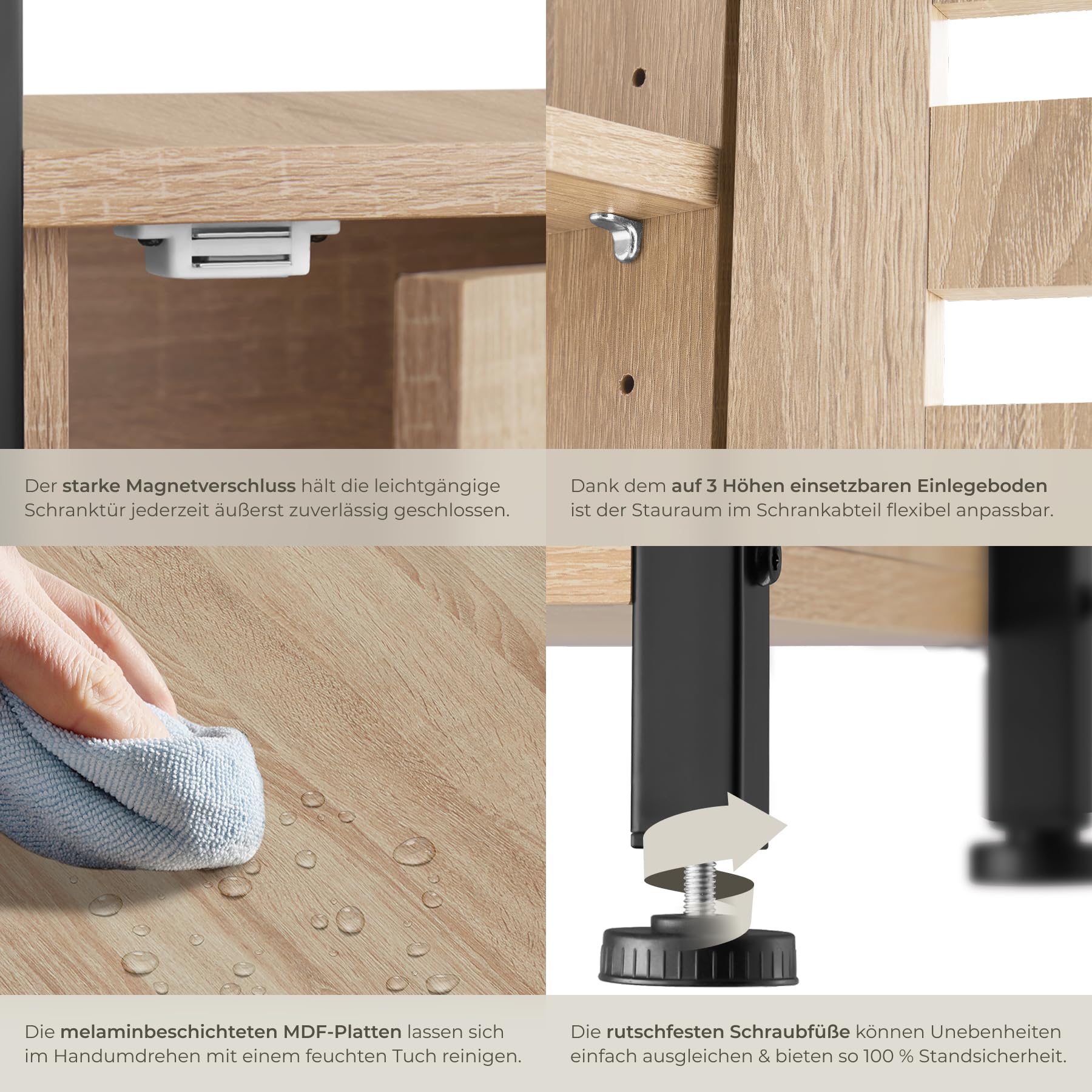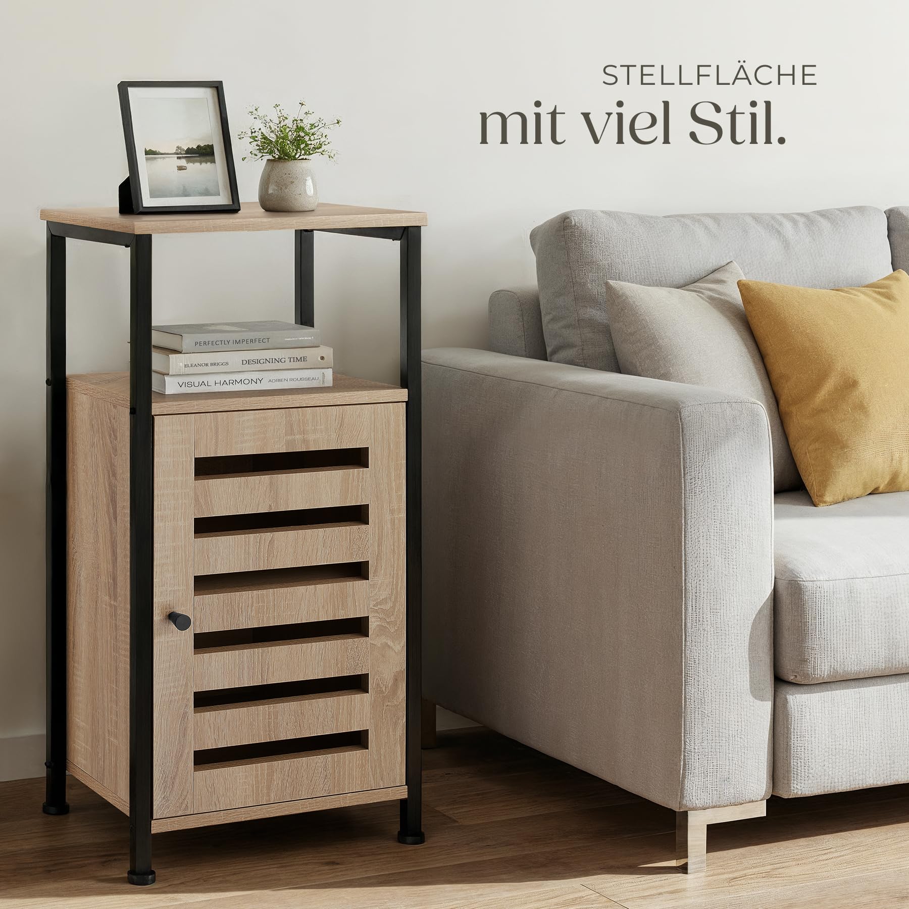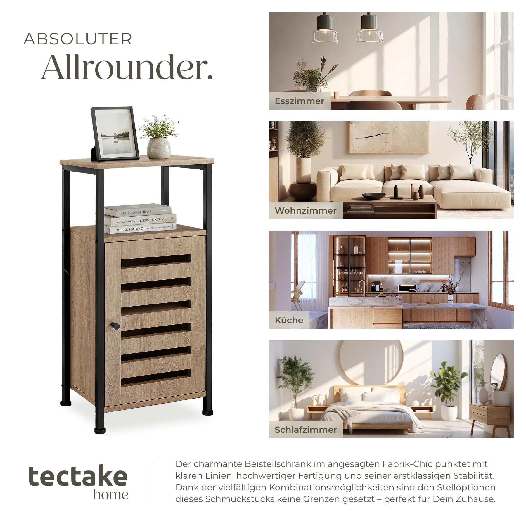 ProduktbeschreibungMit dem trendigen Beistellschrank Durham von tectake setzt Du ein modisches Statement in Deinem Zuhause. Seinen rustikalen Charme verdankt das eckige Möbelstück dem gelungenen Zusammenspiel von kühlem Stahl und warmem Holz.Technische DetailsTotalmasse (BxTxH): ca. 38,5 x 31,5 x 81 cmMasse obere Ablage (BxT): ca. 38 x 30 cmMasse untere Ablage (BxTxH): ca. 33 x 30 x 21,5 cmInnenmasse Schrank (BxTxH): ca. 30 x 26,5 x 49 cmDicke der MDF-Platten: ca. 1,5 cmStahlgestell (BxT): ca. 2 x 2 cmVerstellbarkeit der Kunststofffüsse: ca. 1,5 cmBelastbarkeit: 75 kgGewicht: ca. 13,2 kgMaterial: MDF-Platte, pulverbeschichteter Stahl, PolyethylenLieferumfangBeistellschrankMontagematerialMontageanleitung