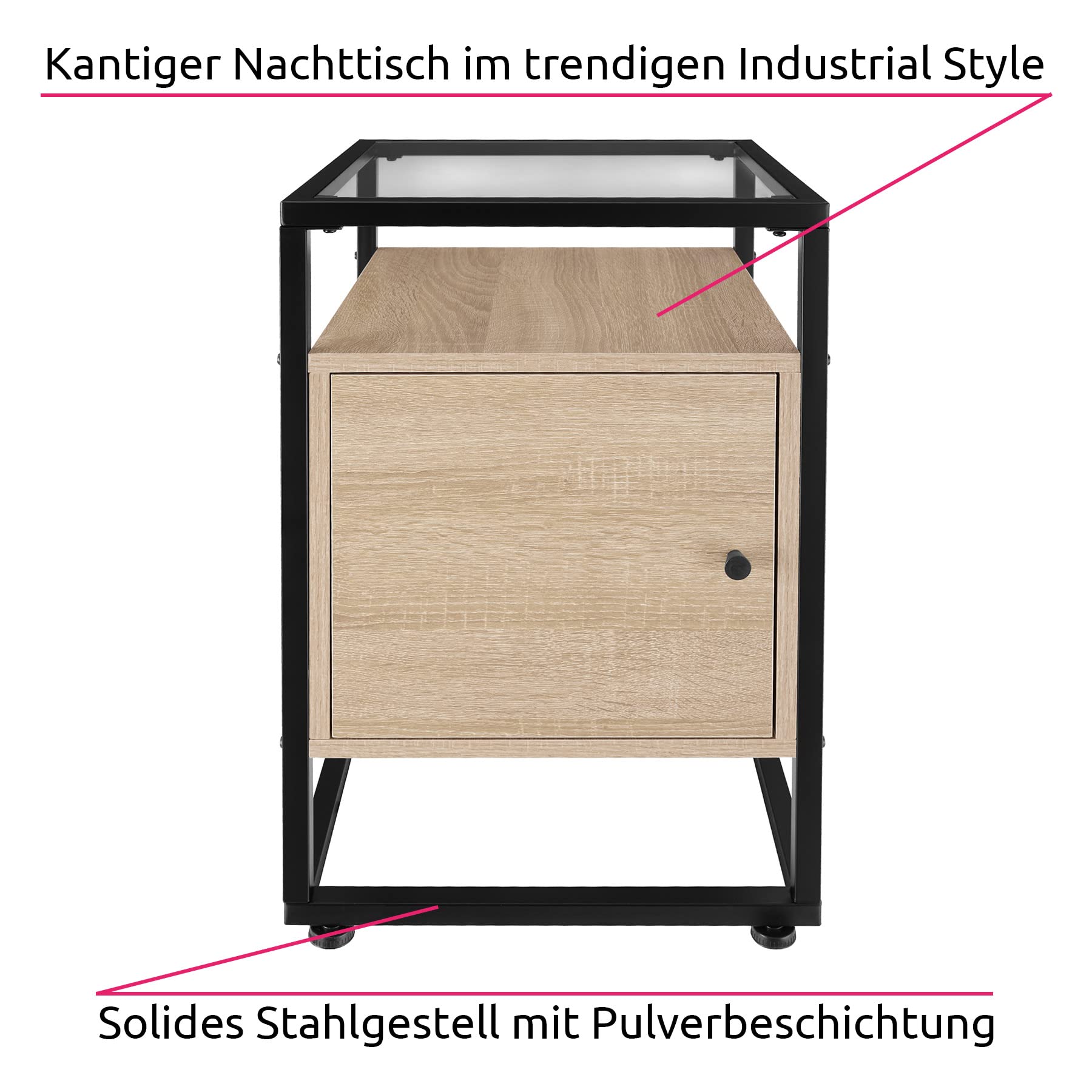ProduktbeschreibungDer eckige Nachttisch Dudley von tectake vereint Holz, Stahl und Glas zu einer eleganten Einheit im trendigen Industrie-Chic. Das markante, aber bewusst reduzierte Design schafft Ruhe und Harmonie und macht das Möbelstück somit perfekt für einen behaglichen Rückzugsort.Technische DetailsTotalmasse (BxTxH): ca. 40 x 43 x 60,5 cmGlasplatte (BxTxH): 358 x 358 x 5 mmOberseite Schrank (BxT): ca. 36 x 40 cmTür (BxH): ca. 32,5 x 29,5 cmInnenmasse Schrank (BxTxH): ca. 33 x 36,5 x 30 cmAbstand zwischen Glasplatte und Schrank: ca. 10,5 cmAbstand zwischen Schrank und unterem Querrahmen: ca. 12 cmDicke der Spanplatten: ca. 1,5 cmStahlgestell (BxT): ca. 2 x 2 cmVerstellbarkeit der Kunststofffüsse: ca. 1,5 cmBelastbarkeit Glasplatte: 20 kgBelastbarkeit Oberseite Schrank: 25 kgBelastbarkeit je Schrankfach: 25 kgGewicht: ca. 12,7 kgMaterial: Spanplatte, pulverbeschichteter Stahl, PolyethylenLieferumfangNachttischMontagematerialMontageanleitung