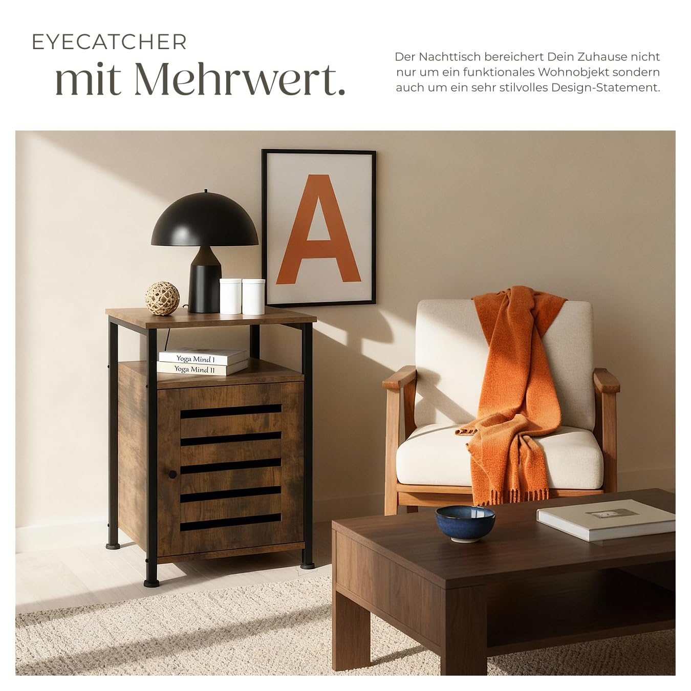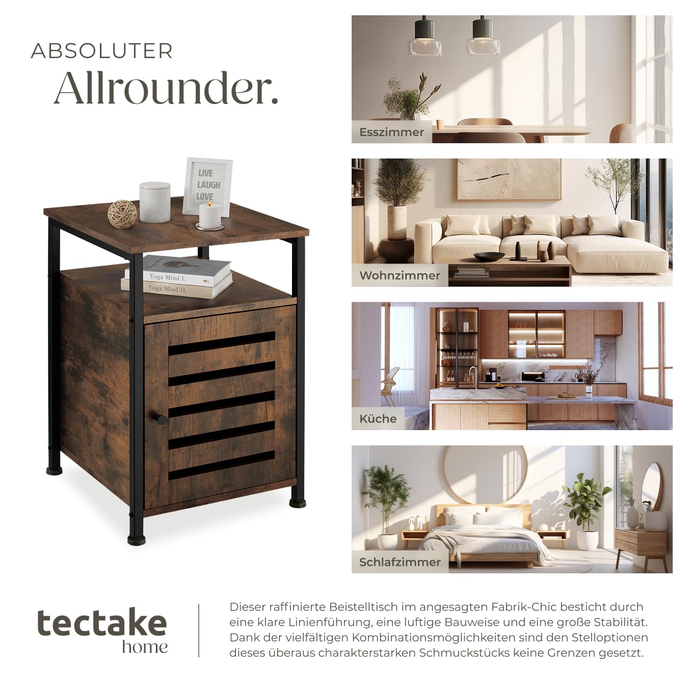 ProduktbeschreibungDer rustikale Beistellschrank Cork von tectake überzeugt durch ein Design, das bewusst auf Ecken und Kanten setzt. Die praktische Höhe, die beiden offenen Ablageflächen sowie die zwei Schrankfächer mit verstellbarem Zwischenboden machen die Nutzung des kompakten Möbels äusserst flexibel.Technische DetailsTotalmasse (BxTxH): ca. 40,5 x 40,5 x 60,5 cmMasse obere Ablage (BxT): ca. 40 x 40 cmMasse untere Ablage (BxTxH): ca. 34,5 x 39 x 13 cmInnenmasse Schrank (BxTxH): ca. 31 x 35,5 x 38 cmDicke der MDF-Platten: ca. 1,5 cmStahlgestell (BxT): ca. 2 x 2 cmVerstellbarkeit der Kunststofffüsse: ca. 1,5 cmBelastbarkeit: 75 kgGewicht: ca. 14 kgMaterial: MDF-Platte, pulverbeschichteter Stahl, PolyethylenLieferumfangBeistellschrankMontagematerialMontageanleitung