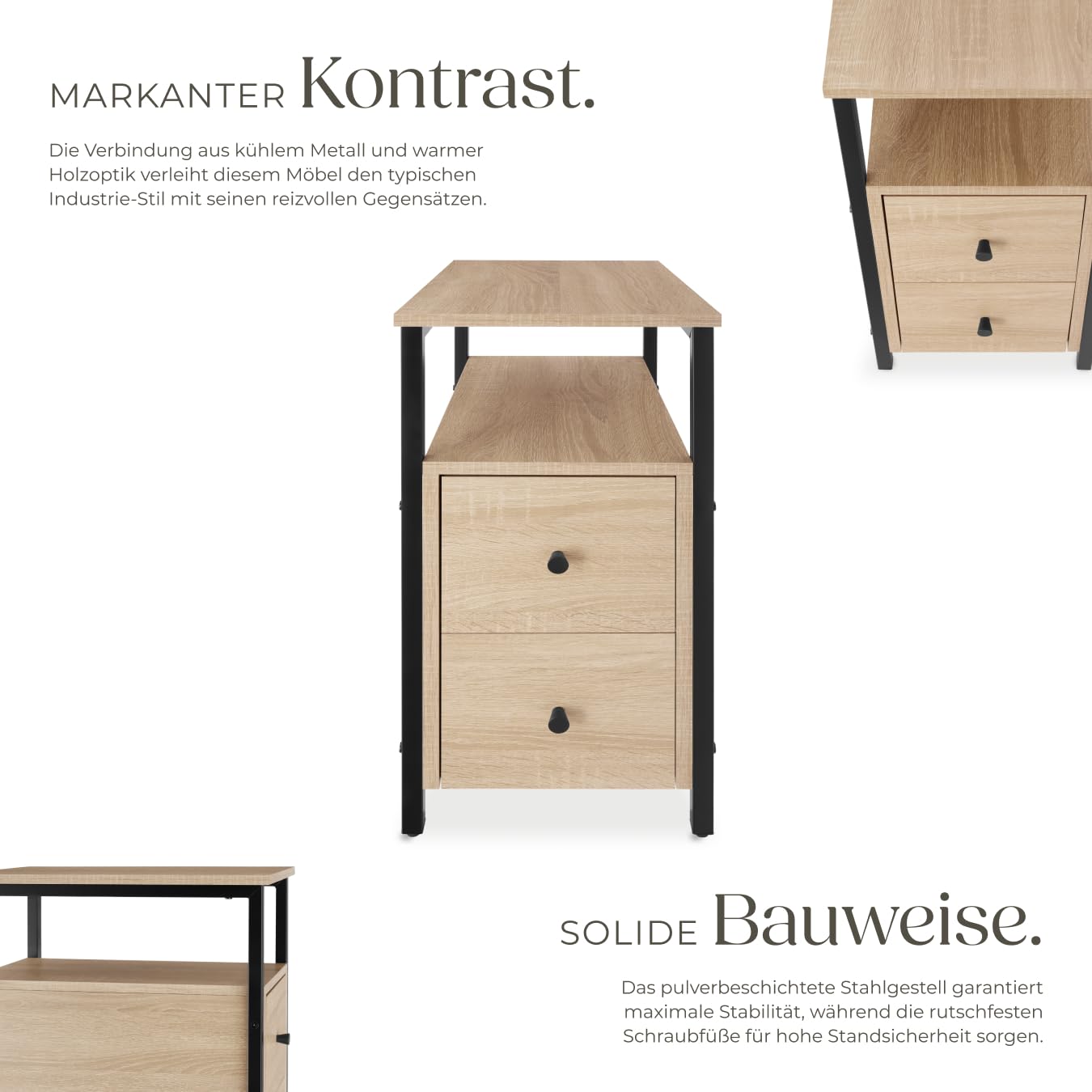ProduktbeschreibungEinen Charakter mit Ecken und Kanten besitzt der raue Nachttisch Tullamore von tectake. Ordentlich Stauraum und Abstellfläche bieten zwei Schubladen und zwei Abstellflächen, die mit ihrer geschmackvollen Maserung auch optisch etwas zu bieten haben.Technische DetailsTotalmasse (BxTxH): ca. 30 x 49,5 x 61,5 cmObere Ablagefläche (BxT): ca. 30 x 48 cmUntere Ablagefläche (BxT): ca. 25 x 46 cmInnenmasse je Schublade (BxTxH): ca. 17 x 40 x 13,5 cmAbstand zwischen oberer und unterer Ablage: ca. 16 cmAbstand zwischen unterer Schublade und Boden: ca. 6 cmDicke der Spanplatten: ca. 1,5 cmStahlgestell (BxT): ca. 2 x 2 cmVerstellbarkeit der Kunststofffüsse: ca. 1,5 cmBelastbarkeit obere Ablagefläche: 50 kgBelastbarkeit untere Ablagefläche: 25 kgBelastbarkeit je Schublade: 10 kgGewicht: ca. 15,6 kgMaterial: Spanplatte, pulverbeschichteter Stahl, PolyethylenLieferumfangNachttischMontagematerialMontageanleitung