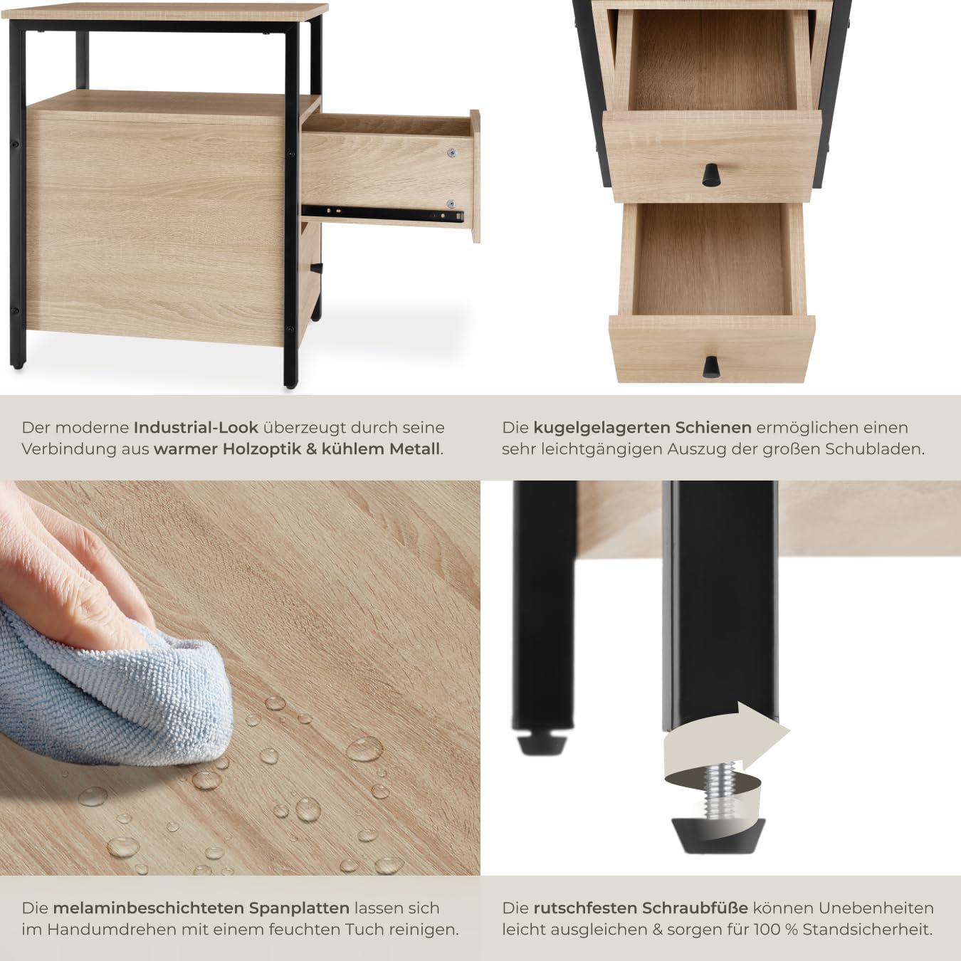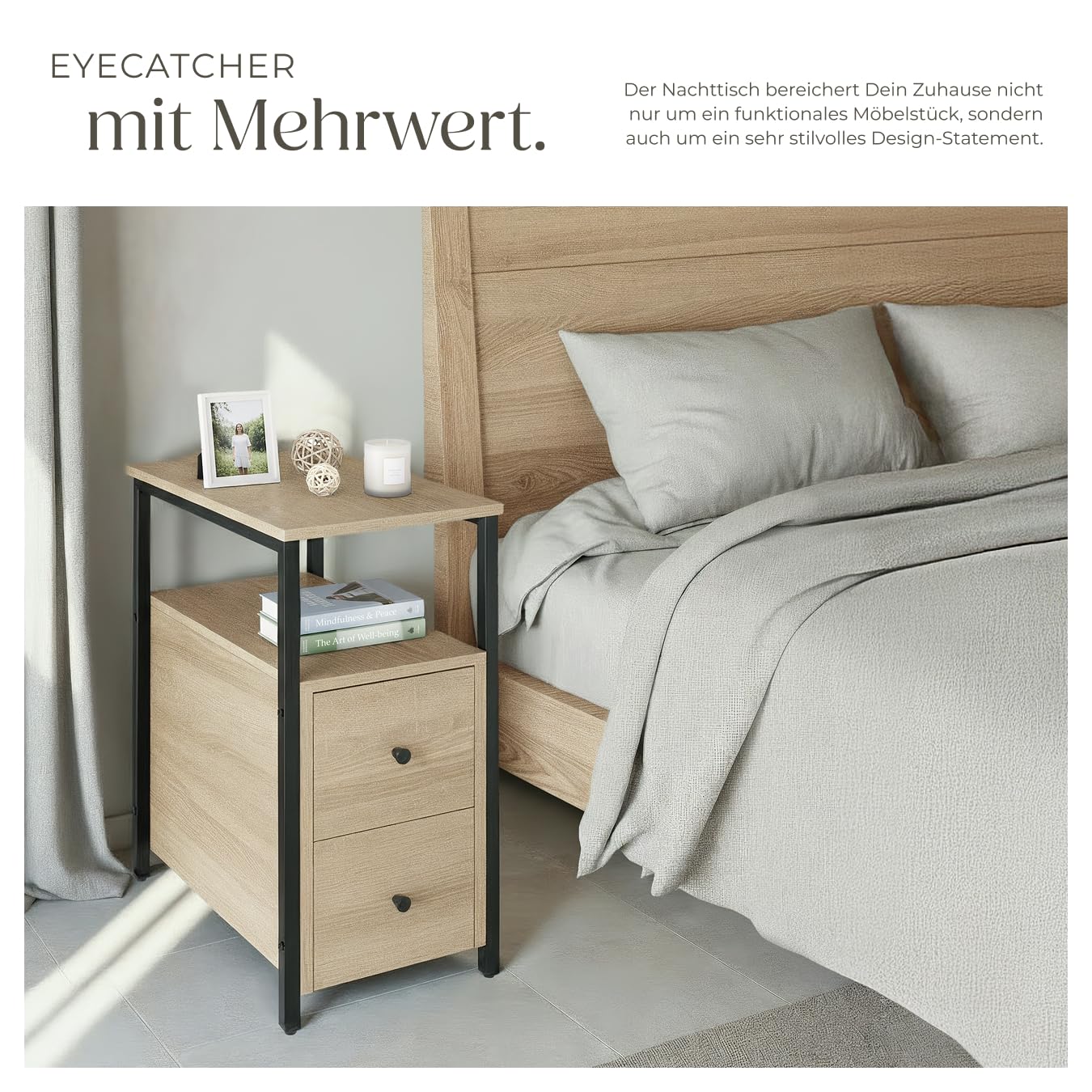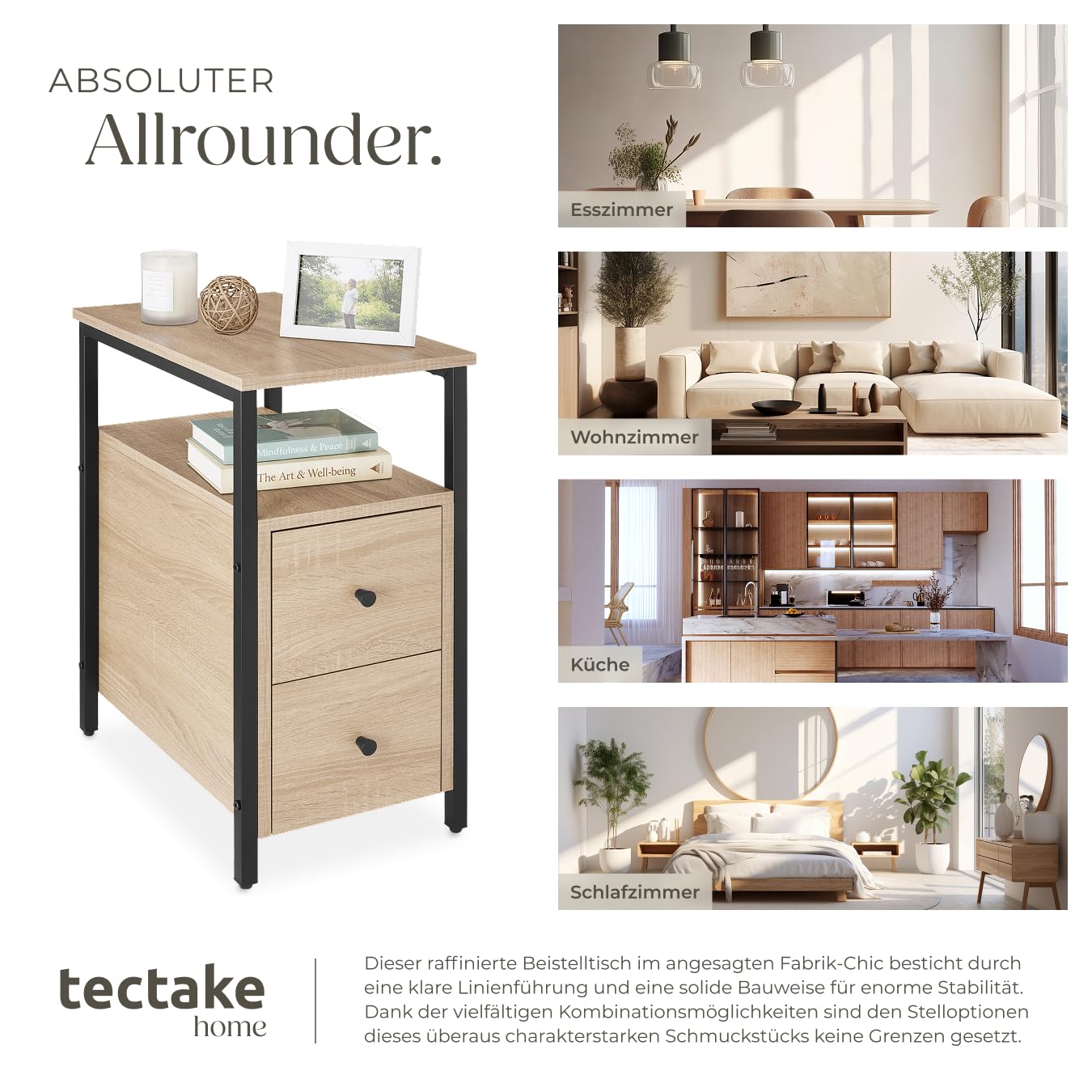 tectake® Nachttisch schmal, Nachtschrank mit 2 Schubladen und 2 Ablagen, schmaler Schrank 30 x 49,5 x 61,5 cm, Nischenschrank, Nachtkästchen, Beistelltisch schmal - Industrial Holz hell, Eiche Sonoma