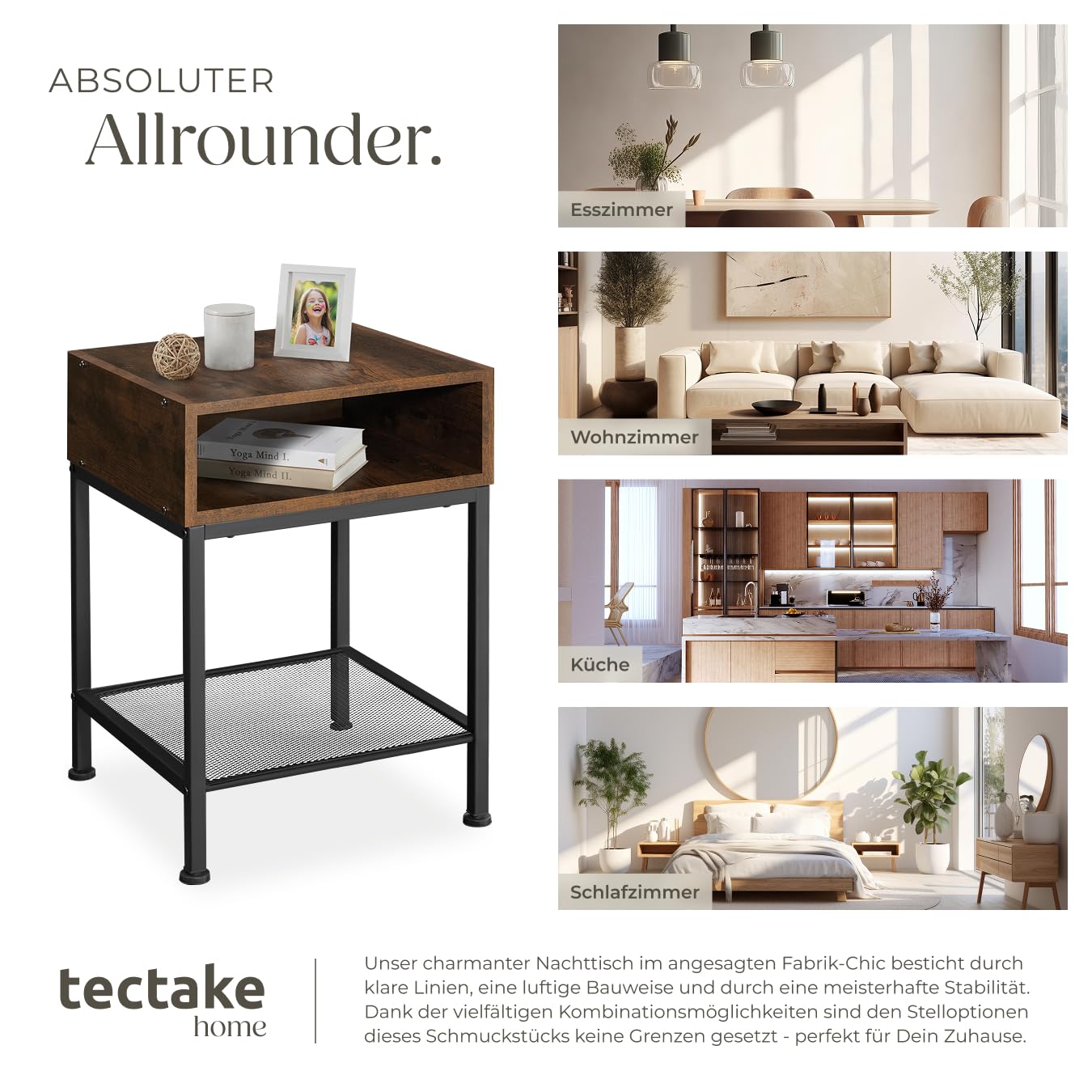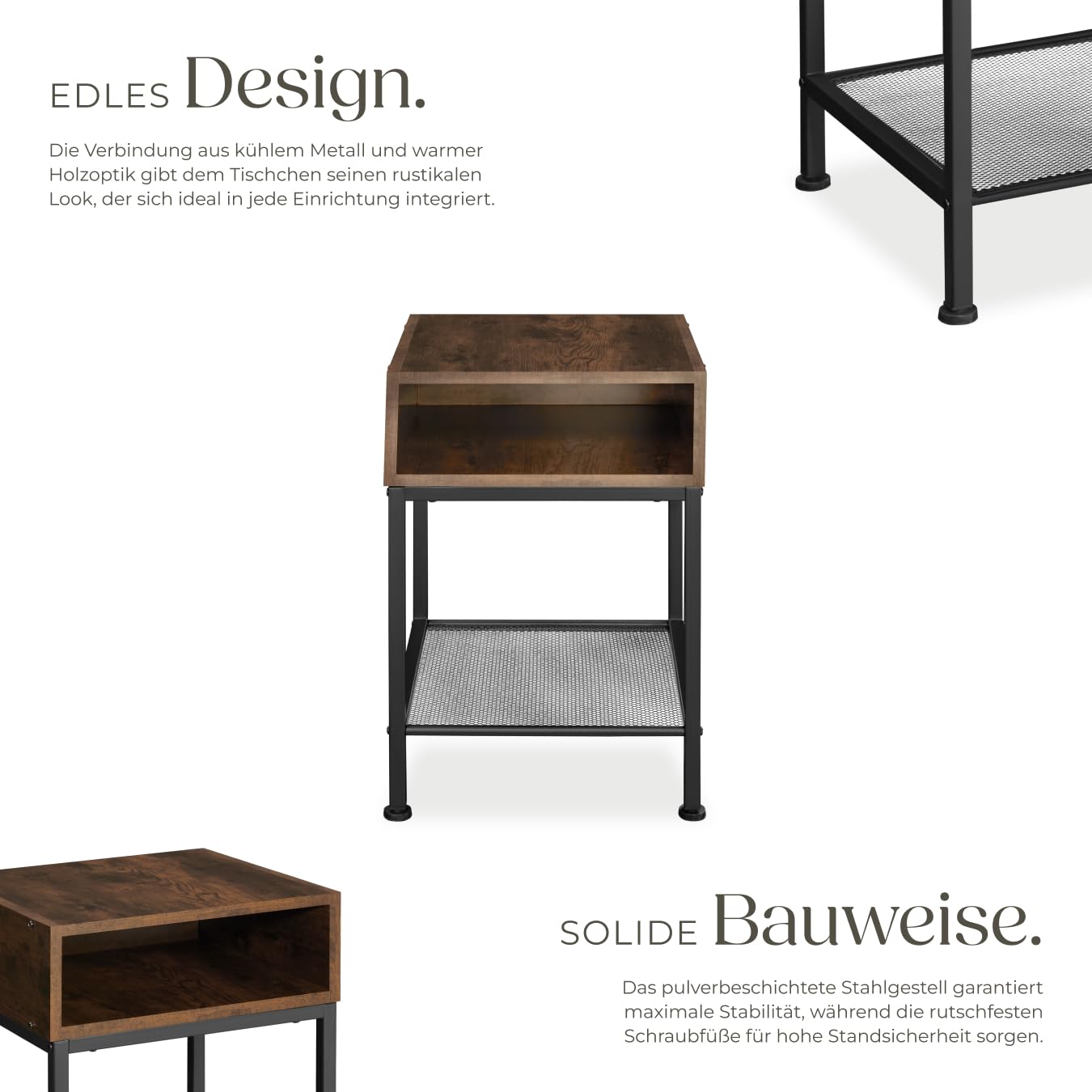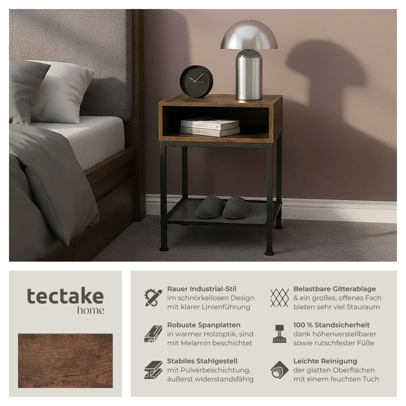 ProduktbeschreibungDer trendige Mix aus warmem Holz und kühlem Stahl prägt das raue Erscheinungsbild des Nachttischs Harlow von tectake. Auf drei verschiedenen Ablageflächen bietet die stabile und belastbare Konstruktion Platz für kleine und grössere Dinge.Technische DetailsTotalmasse (BxTxH): ca. 40,5 x 40,5 x 59 cmMasse obere Ablage (BxT): ca. 40 x 40 cmInnenmasse Fach (BxTxH): ca. 37 x 39 x 12 cmAbstand zwischen Fach und Gitterablage: ca. 30 cmAbstand zwischen Gitterablage und Boden: ca. 10,5 cmDicke der Spanplatten: ca. 1,5 cmStahlgestell (BxT): ca. 2 x 2 cmVerstellbarkeit der Kunststofffüsse: ca. 1,5 cmBelastbarkeit obere Ablagefläche: 75 kgBelastbarkeit Fach: 20 kgBelastbarkeit Gitterablage: 20 kgGewicht: ca. 7,5 kgMaterial: Spanplatte, pulverbeschichteter Stahl, PolyethylenLieferumfangNachttischMontagematerialMontageanleitung