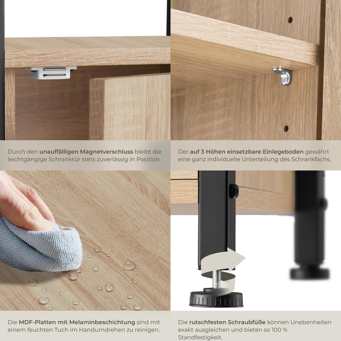 ProduktbeschreibungDer rustikale Beistellschrank Cork von tectake überzeugt durch ein Design, das bewusst auf Ecken und Kanten setzt. Die praktische Höhe, die beiden offenen Ablageflächen sowie die zwei Schrankfächer mit verstellbarem Zwischenboden machen die Nutzung des kompakten Möbels äusserst flexibel.Technische DetailsTotalmasse (BxTxH): ca. 40,5 x 40,5 x 60,5 cmMasse obere Ablage (BxT): ca. 40 x 40 cmMasse untere Ablage (BxTxH): ca. 34,5 x 39 x 13 cmInnenmasse Schrank (BxTxH): ca. 31 x 35,5 x 38 cmDicke der MDF-Platten: ca. 1,5 cmStahlgestell (BxT): ca. 2 x 2 cmVerstellbarkeit der Kunststofffüsse: ca. 1,5 cmBelastbarkeit: 75 kgGewicht: ca. 14 kgMaterial: MDF-Platte, pulverbeschichteter Stahl, PolyethylenLieferumfangBeistellschrankMontagematerialMontageanleitung