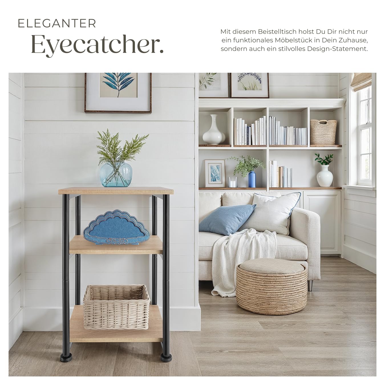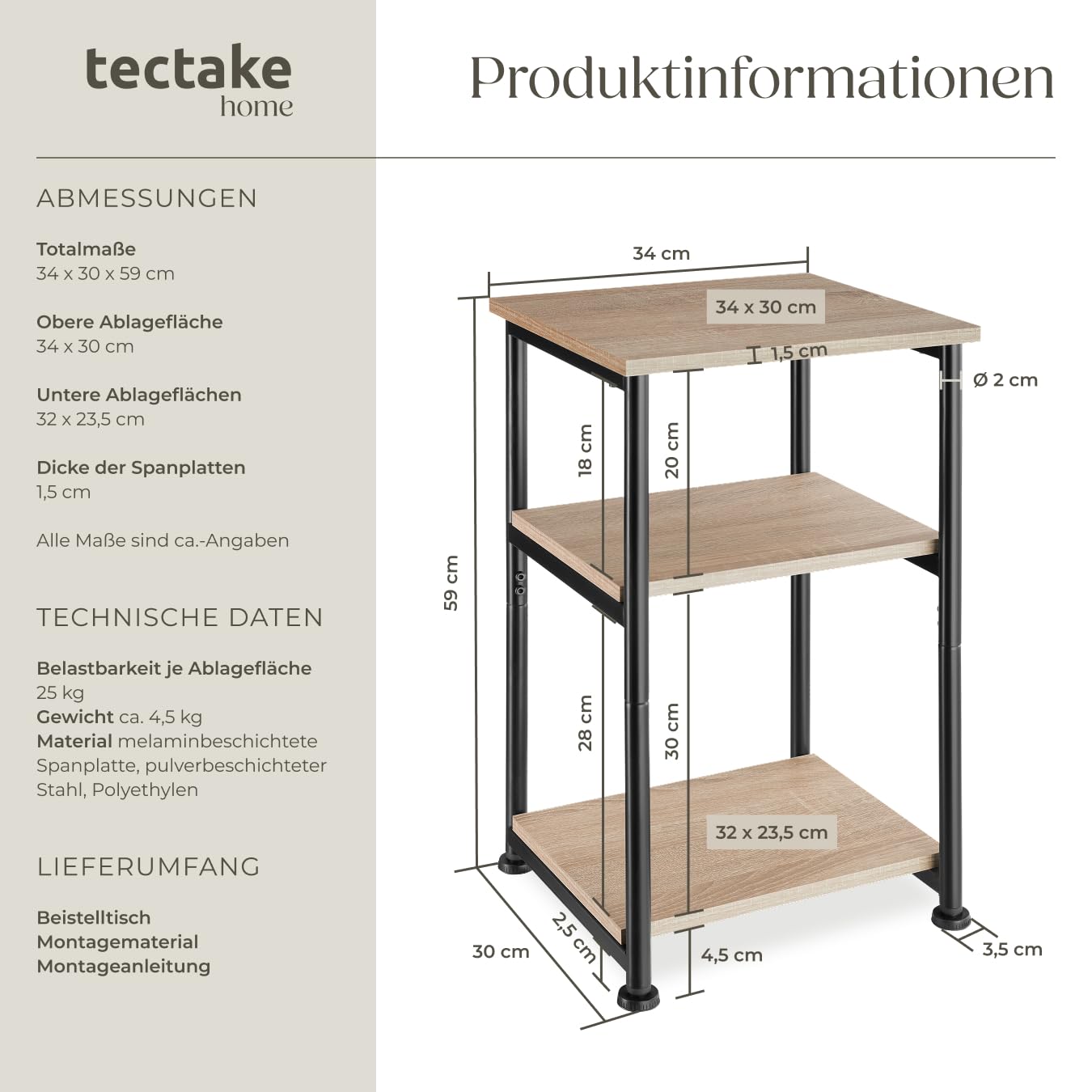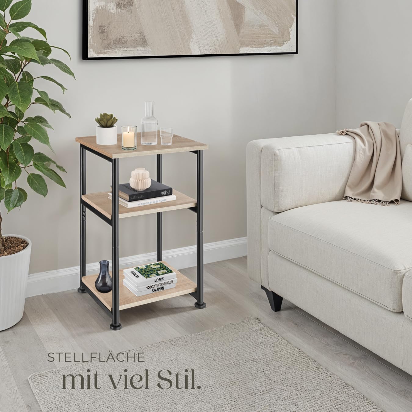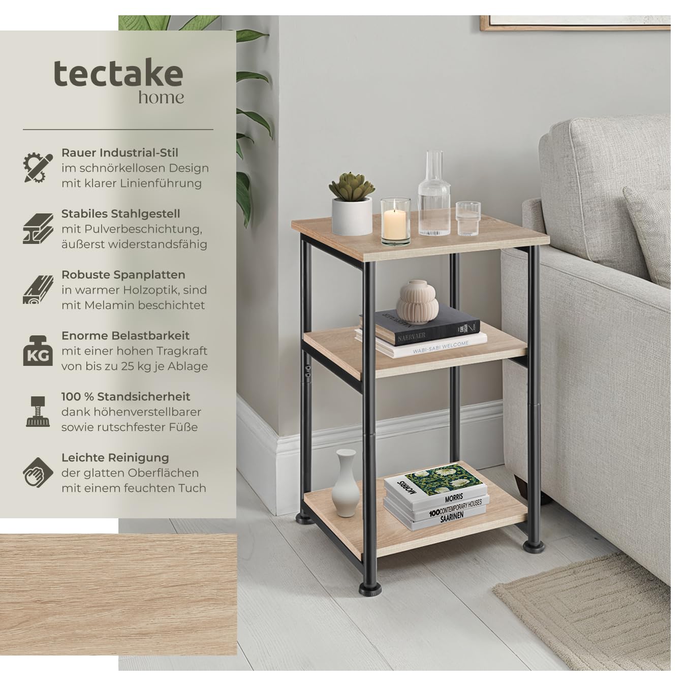 tectake® Beistelltisch, Couchtisch mit Stauraum auf 3 Ebenen aus Holz + Metall, Nachttisch 34 x 30 x 59 cm, Couch Tisch Wohnzimmer Möbel, Deko Schlafzimmer - Industrial Holz hell, Eiche Sonoma