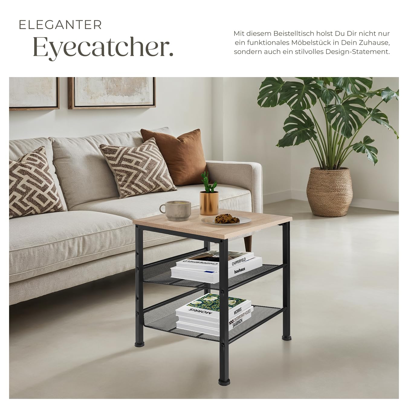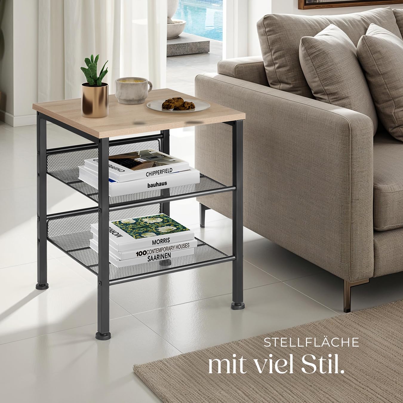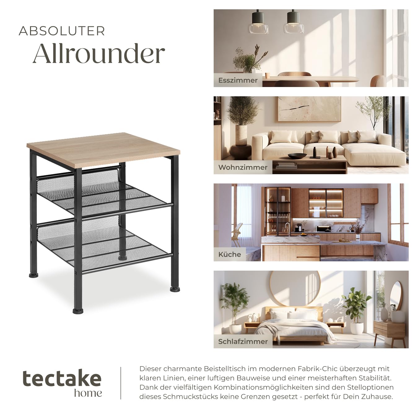 ProduktbeschreibungVerleihe Deinem Zuhause einen urbanen Touch mit dem rustikalen Beistelltisch Lincoln von tectake. Kennzeichnend für das schnörkellose Design beim Industrial Style ist die Konzentration auf das Wesentliche und die Verwendung der Materialien Holz und Stahl.Technische DetailsTotalmasse (BxTxH): ca. 40,5 x 40 x 50,5 cmObere Ablage (BxT): ca. 40 x 40 cmDicke der MDF-Platte: ca. 1,5 cmGitterablagen (BxT): ca. 34 x 36 cmAbstand zwischen oberer Ablage und oberer Gitterablage: ca. 17,5 cmAbstand zwischen oberer Gitterablage und unterer Gitterablage: ca. 17,5 cmAbstand zwischen unterer Gitterablage und Boden: ca. 12,5 cmStahlgestell (BxT): ca. 2 x 2 cmVerstellbarkeit der Kunststofffüsse: ca. 1,5 cmBelastbarkeit obere Ablagefläche: 75 kgBelastbarkeit Gitterflächen: 25 kgGewicht: ca. 4,3 kgMaterial: MDF-Platte, pulverbeschichteter Stahl, PolyethylenLieferumfangBeistelltischMontagematerialMontageanleitung