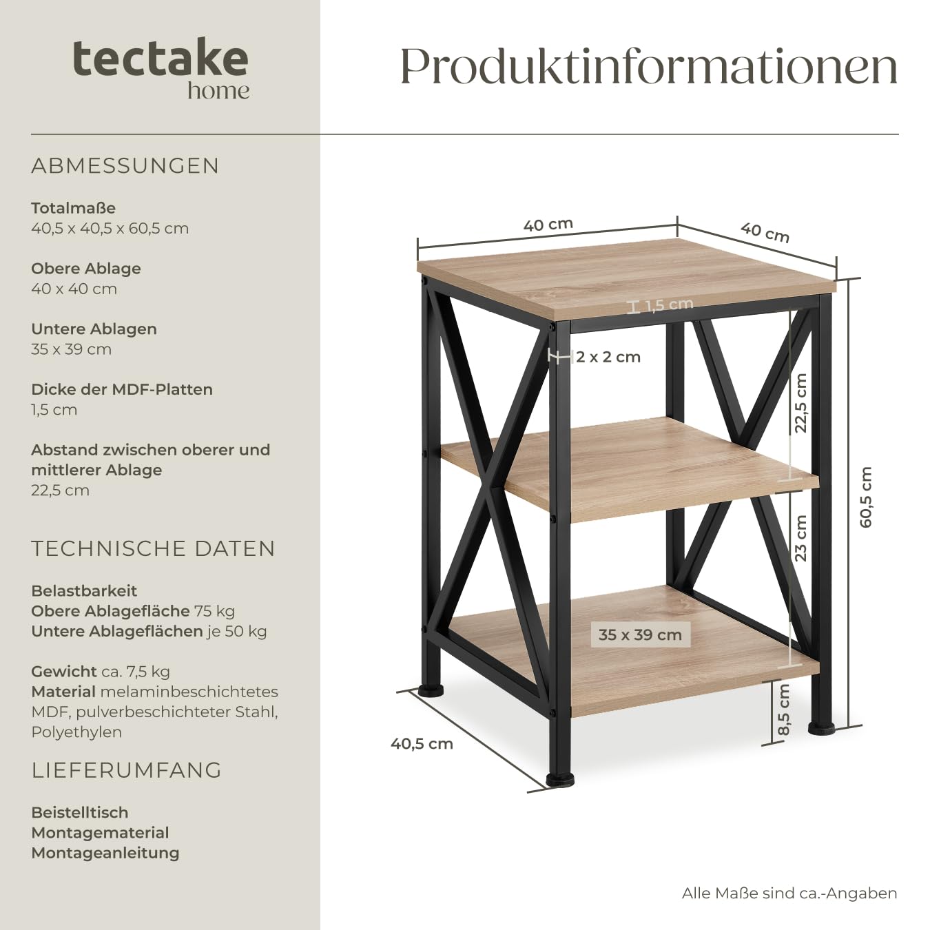 ProduktbeschreibungDer solide Beistelltisch Nottingham von tectake verleiht Deinem Zuhause eine Portion rustikalen Charme. Die edle Holzoptik und das schwarze Stahlgestell mit den markanten Diagonalstreben erzeugen einen farblich stimmigen, attraktiven Kontrast.Technische DetailsTotalmasse (BxTxH): ca. 40,5 x 40,5 x 60,5 cmMasse obere Ablage (BxT): ca. 40 x 40 cmMasse untere Ablagen (BxT): ca. 35 x 39 cmAbstand zwischen oberer und mittlerer Ablage: ca. 22,5 cmAbstand zwischen mittlerer und unterer Ablage: ca. 23 cmAbstand zwischen unterer Ablage und Boden: ca. 8,5 cmDicke der MDF-Platten: ca. 1,5 cmStahlgestell (BxT): ca. 2 x 2 cmVerstellbarkeit der Kunststofffüsse: ca. 1,5 cmBelastbarkeit obere Ablagefläche: 75 kgBelastbarkeit je unterer Ablagefläche: 50 kgGewicht: ca. 7,6 kgMaterial: MDF-Platte, pulverbeschichteter Stahl, PolyethylenLieferumfangBeistelltischMontagematerialMontageanleitung