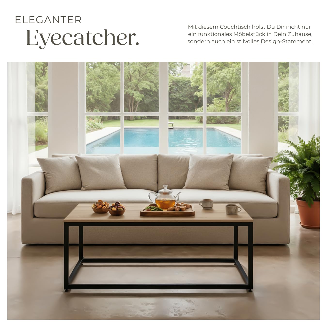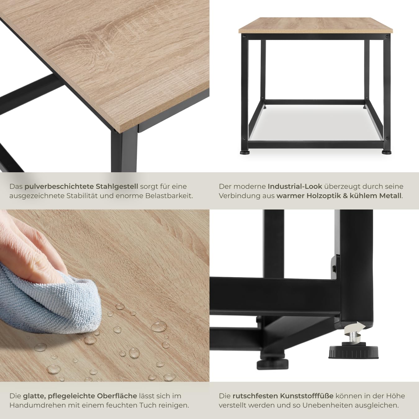 ProduktbeschreibungMit dem eckigen Couchtisch Lynch von tectake bereicherst Du Dein Wohnzimmer um einen ebenso geschmackvollen wie praktischen Vertreter des angesagten Industrie-Looks. Der kühle Stahl des pulverbeschichteten Gestells ist das ideale Pendant zu der belastbaren Ablagefläche in warmer Holzoptik.Technische DetailsTotalmasse (BxTxH): ca. 100 x 55 x 45,5 cmDicke der Spanplatte: ca. 1,5 cmStahlgestell (BxT): ca. 2,5 x 2,5 cmVerstellbarkeit der Kunststofffüsse: ca. 1,5 cmBelastbarkeit: 100 kgGewicht: ca. 9,9 kgMaterial: Spanplatte, pulverbeschichteter Stahl, PolyethylenLieferumfangCouchtischMontagematerialMontageanleitung