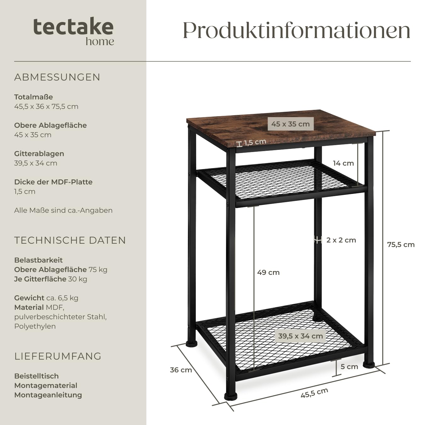 ProduktbeschreibungAblegen, hinstellen, dekorieren und inszenieren – den Einsatzmöglichkeiten des schlanken Beistelltischs York von tectake setzt nur die eigene Kreativität Grenzen. Mit seiner geringen Grundfläche und den drei Ebenen bietet die offene Konstruktion im urbanen Industrial Style viel Raum auf wenig Platz.Technische DetailsTotalmasse (BxTxH): ca. 45,5 x 36 x 75,5 cmObere Ablagefläche (BxT): ca. 45 x 35 cmDicke der MDF-Platte: ca. 1,5 cmGitterablagen (BxT): ca. 39,5 x 34 cmZwischenraum obere Ablagefläche und obere Gitterfläche: ca. 14 cmZwischenraum obere Gitterfläche zu unterer Gitterfläche: ca. 49 cmAbstand zwischen unterem Gitterrahmen und Boden: ca. 5 cmStahlgestell (BxT): ca. 2 x 2 cmVerstellbarkeit der Kunststofffüsse: ca. 1,5 cmBelastbarkeit obere Ablagefläche: 75 kgBelastbarkeit Gitterflächen: je 30 kgGewicht: ca. 6,5 kgMaterial: MDF-Platte, pulverbeschichteter Stahl, PolyethylenLieferumfangBeistelltischMontagematerialMontageanleitung