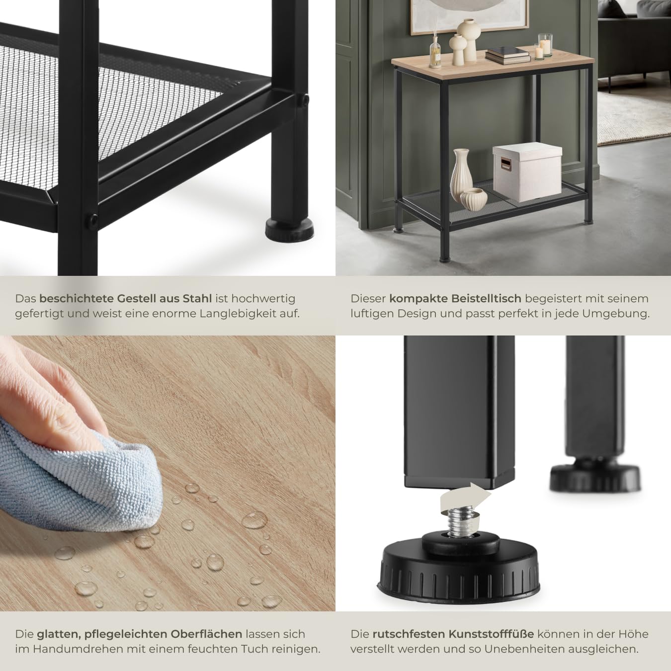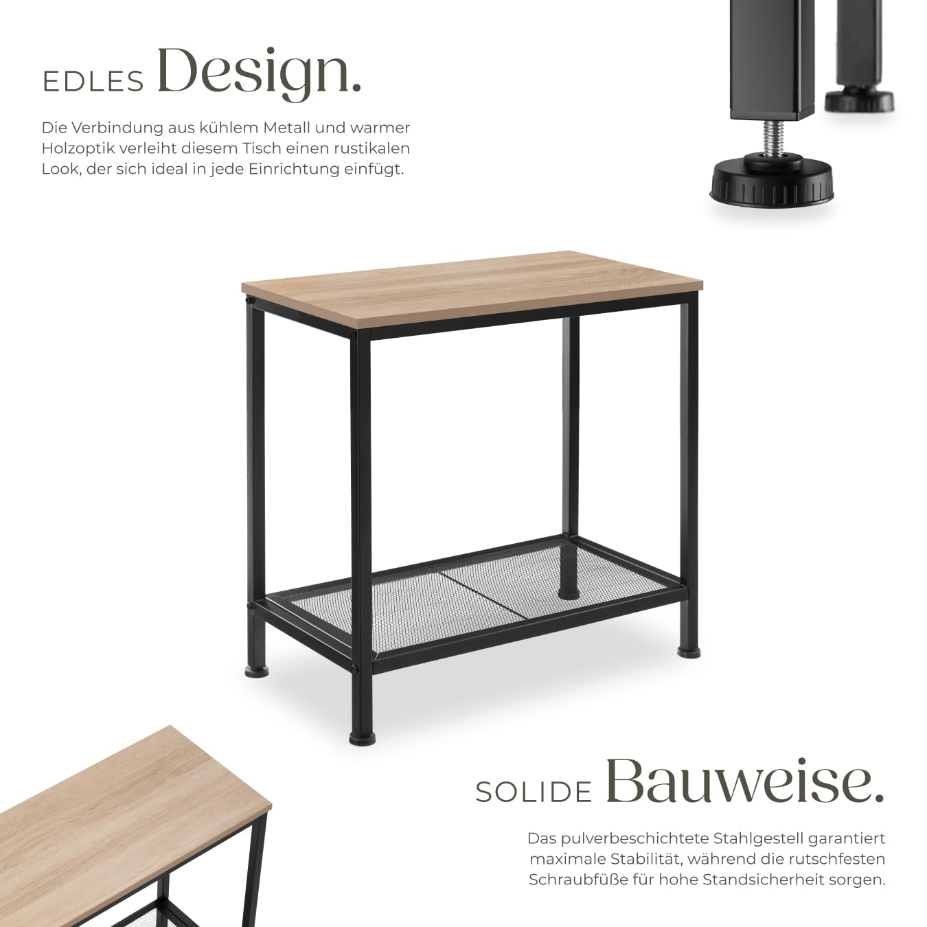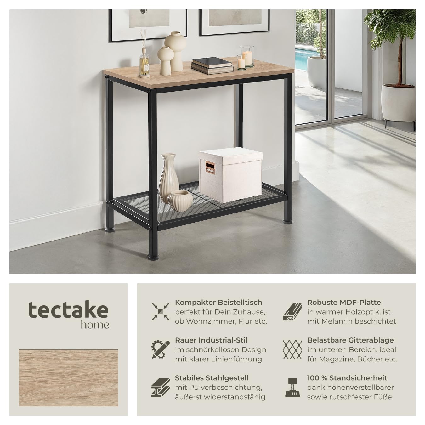 ProduktbeschreibungDer schmale Beistelltisch Filton von tectake macht aus unscheinbaren Ecken und Nischen schicke Blickfänger oder nutzbaren Stauraum. Zwei Ebenen bieten eine hervorragende Kulisse zur Präsentation von Pflanzen, Bildern und weiteren geliebten Dingen oder dienen als Ablage von Alltagsgegenständen.Technische DetailsTotalmasse (BxTxH): ca. 60 x 30,5 x 60,5 cmObere Ablage (BxT): ca. 60 x 30 cmGitterablage (BxT): ca. 58,5 x 29 cmAbstand zwischen Gitterablage und oberer Ablage: ca. 46 cmAbstand zwischen Gitterablage und Boden: ca. 9,5 cmDicke der MDF-Platte: ca. 1,5 cmStahlgestell (BxT): ca. 2 x 2 cmVerstellbarkeit der Kunststofffüsse: ca. 1,5 cmBelastbarkeit obere Ablage: 75 kgBelastbarkeit Gitterablage: 30 kgGewicht: ca. 4,8 kgMaterial: MDF-Platte, pulverbeschichteter Stahl, PolyethylenLieferumfangBeistelltischMontagematerialMontageanleitung
