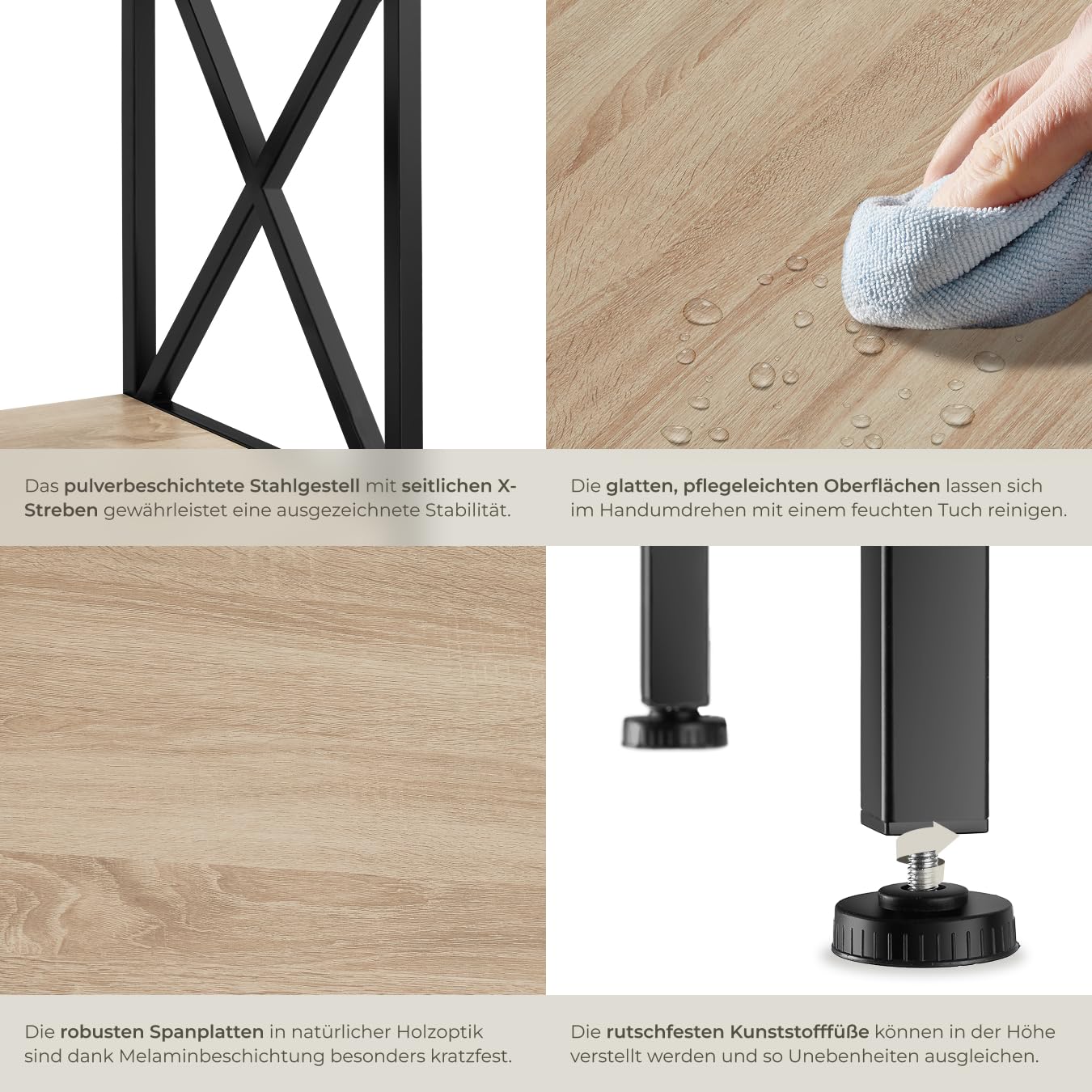 ProduktbeschreibungDer offen gestaltete Beistelltisch Carlton von tectake ist ein kleines Möbelstück mit grosser Ausstrahlung. Die warmen Farben der Holzflächen und das schwarze Gestell mit den markanten Diagonalstreben ergeben jenen stimmigen Kontrast, der den typischen Charakter des Industrie-Stils kennzeichnet.Technische DetailsTotalmasse (BxTxH): ca. 40,5 x 40,5 x 52,5 cmMasse obere Ablage (BxT): ca. 40 x 40 cmMasse untere Ablage (BxT): ca. 35 x 39 cmAbstand zwischen oberer und unterer Ablage: ca. 38 cmAbstand zwischen unterer Ablage und Boden: ca. 12 cmDicke der Spanplatten: ca. 1,5 cmStahlgestell (BxT): ca. 2 x 2 cmVerstellbarkeit der Kunststofffüsse: ca. 1,5 cmBelastbarkeit obere Ablagefläche: 75 kgBelastbarkeit untere Ablagefläche: 25 kgGewicht: ca. 6 kgMaterial: Spanplatte, pulverbeschichteter Stahl, PolyethylenLieferumfangBeistelltischMontagematerialMontageanleitung
