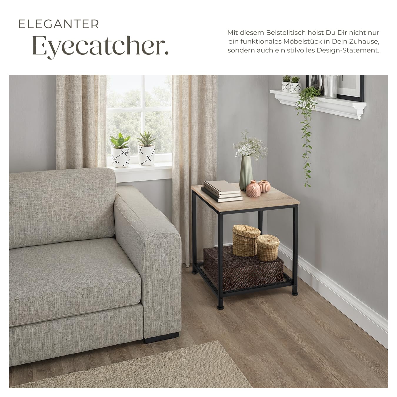 ProduktbeschreibungSchlicht, rau, kantig und dennoch ansprechend – so präsentiert sich der Beistelltisch Derby von tectake. Die rustikale Würfelkonstruktion bietet viel Gestaltungsraum für Accessoires oder persönliche Schmuckstücke und punktet mit Stabilität und Belastbarkeit.Technische DetailsTotalmasse (BxTxH): ca. 45,5 x 45,5 x 55,5 cmObere Ablagefläche (BxT): ca. 45 x 45 cmDicke der MDF-Platte: ca. 1,5 cmGitterablage (BxT): ca. 44 x 39,5 cmZwischenraum obere Ablage und Gitter: ca. 45 cmAbstand zwischen Gitterrahmen und Boden: ca. 5 cmStahlgestell (BxT): ca. 2 x 2 cmVerstellbarkeit der Kunststofffüsse: ca. 1,5 cmBelastbarkeit obere Ablagefläche: 75 kgBelastbarkeit Gitterfläche: 30 kgGewicht: ca. 5,8 kgMaterial: MDF-Platte, pulverbeschichteter Stahl, PolyethylenLieferumfangBeistelltischMontagematerialMontageanleitung