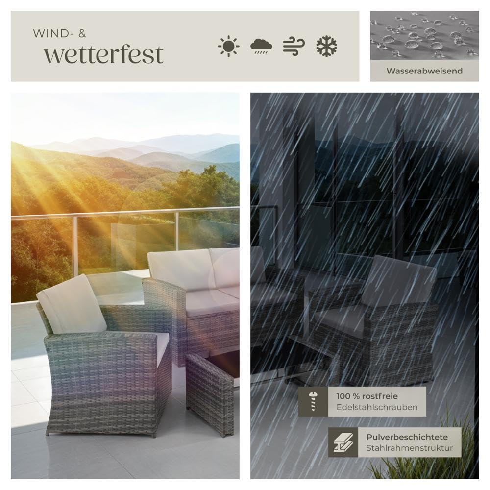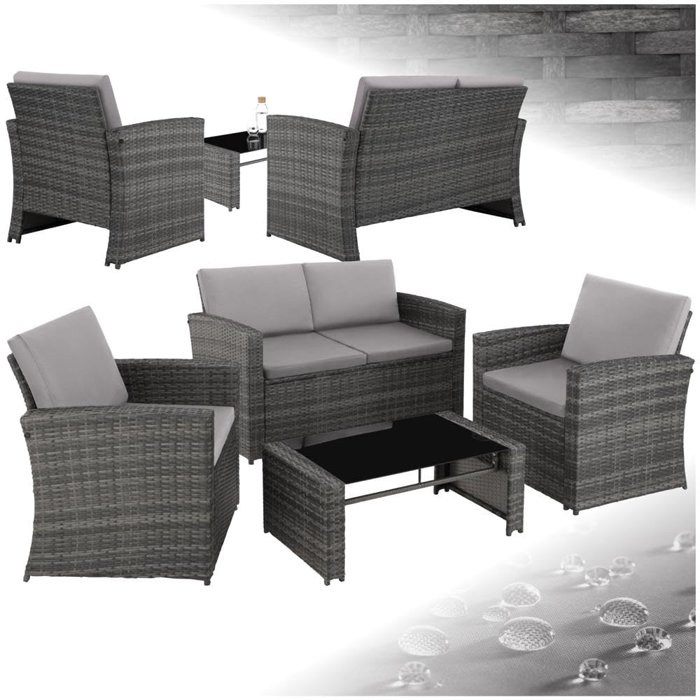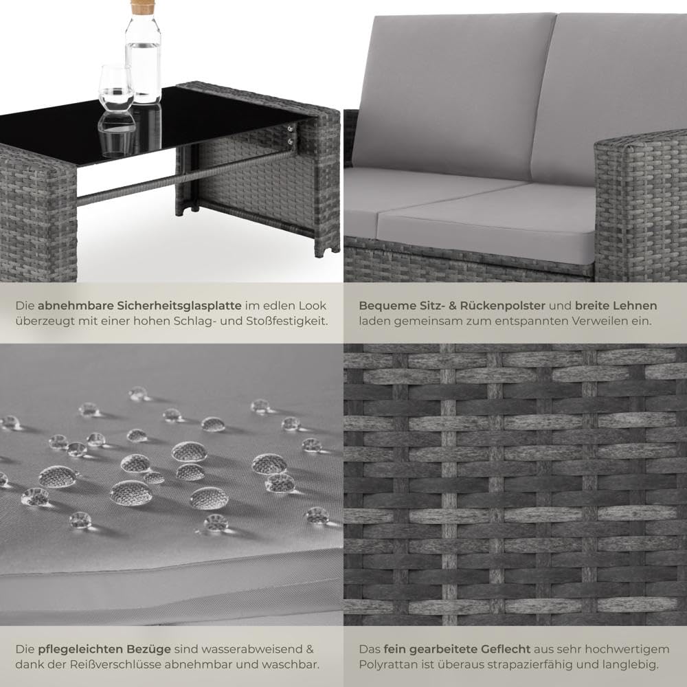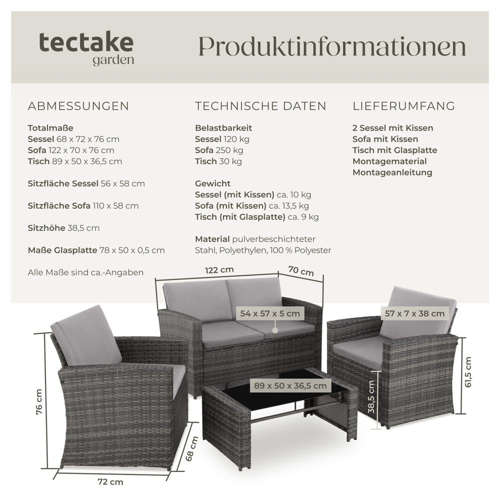 ProduktbeschreibungWohlig bequem, optisch ansprechend und äusserst pflegeleicht – diese Rattan-Sitzgruppe von tectake punktet in vielen Bereichen. Dank der komfortablen Arm- und Rückenlehnen und der gemütlichen Polsterung lässt es sich auf den beiden Sesseln und auf dem Sofa hervorragend entspannen. Schmackhafte Getränke und leckeres Fingerfood sind auf der robusten Sicherheitsglasplatte in schickem Schwarz immer in Reichweite. Unter dem attraktiven Geflecht sorgen die soliden Stahlgestelle für die ausgezeichnete Stabilität und die hohe Belastbarkeit – schaffe einen Ort für gesellige Stunden mit der stilvollen Gartengarnitur von tectake.Technische DetailsSesselTotalmasse (BxTxH): ca. 68 x 72 x 76 cmSitzfläche (BxT): ca. 56 x 58 cmSitzhöhe: ca. 38,5 cmRückenlehne (BxH): ca. 56 x 39,5 cmHöhe Armlehne: ca. 61,5 cmMasse Sitzkissen (BxTxH): ca. 54 x 57 x 5 cmMasse Rückenkissen (BxTxH): ca. 57 x 7 x 38 cmBelastbarkeit: 120 kgGewicht (mit Kissen): ca. 10 kgSofaTotalmasse (BxTxH): ca. 122 x 70 x 76 cmSitzfläche: (BxTxH): ca. 110 x 58 cmSitzhöhe: ca. 38,5 cmRückenlehne (BxH): ca. 110 x 39,5 cmHöhe Armlehne: ca. 61,5 cmMasse Sitzkissen (BxTxH): ca. 54 x 57 x 5 cmMasse Rückenkissen (BxTxH): ca. 57 x 7 x 38 cmBelastbarkeit: 250 kgGewicht (mit Kissen): ca. 13,3 kgTischTotalmasse (LxBxH): ca. 89 x 50 x 36,5 cmMasse Glasplatte (LxBxH): ca. 78 x 50 x 0,5 cmBelastbarkeit: 30 kgGewicht (mit Glasplatte): ca. 9 kgMaterial: pulverbeschichteter Stahl, Polyethylen, 100 % PolyesterLieferumfang2 Sessel mit Kissen1 Sofa mit Kissen1 Tisch mit GlasplatteMontagematerialAufbauanleitung
