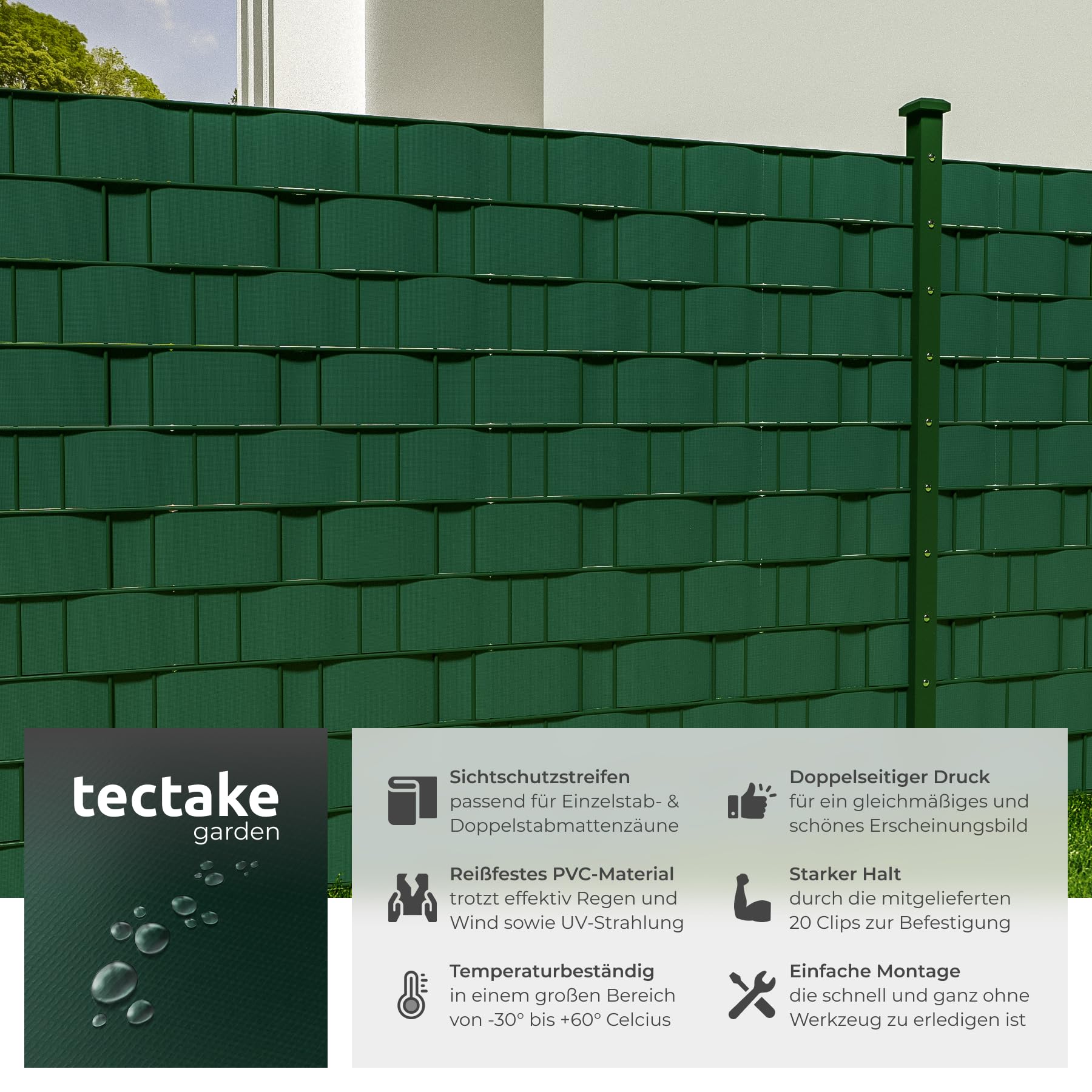 tectake® Sichtschutzfolie, Sichtschutzstreifen mit Befestigungsclips, Windschutz, Sonnenschutz, Sichtschutzmatte für Balkon, Garten, Terrasse, für Stabmattenzaun und Zaunelemente - 35 m, grün