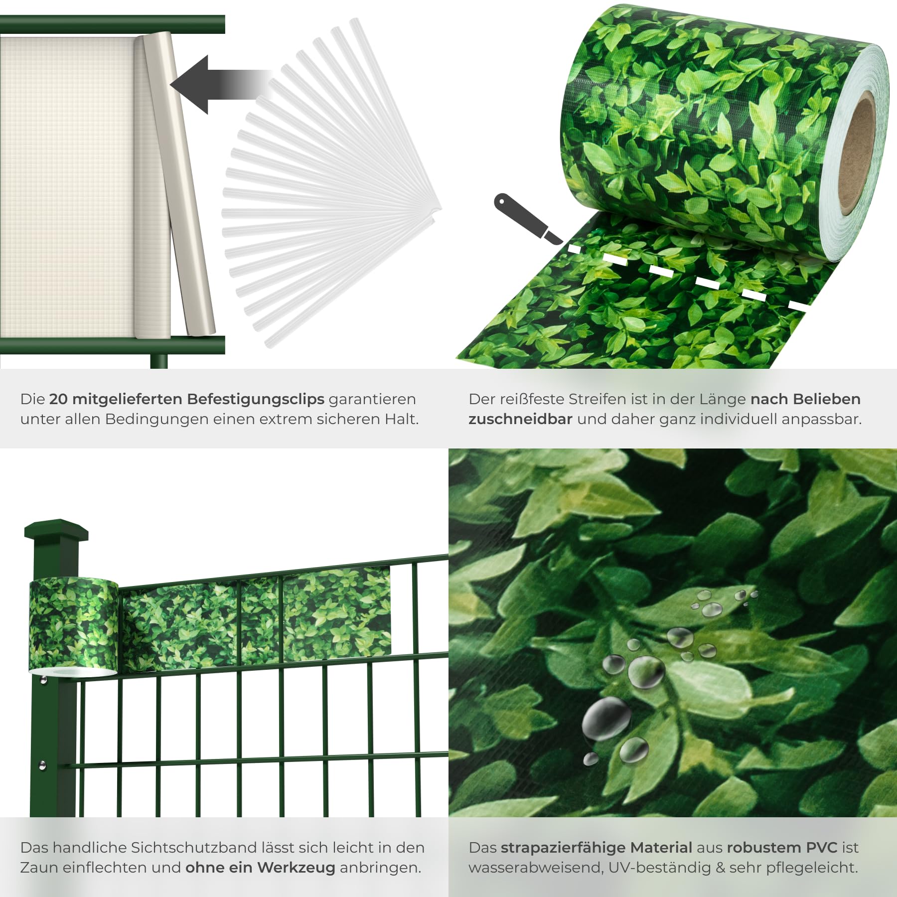 tectake® Sichtschutzfolie, Sichtschutzstreifen mit Befestigungsclips, Windschutz, Sonnenschutz, Sichtschutzmatte für Balkon, Garten, Terrasse, für Stabmattenzaun und Zaunelemente - 35 m, grünes Laub