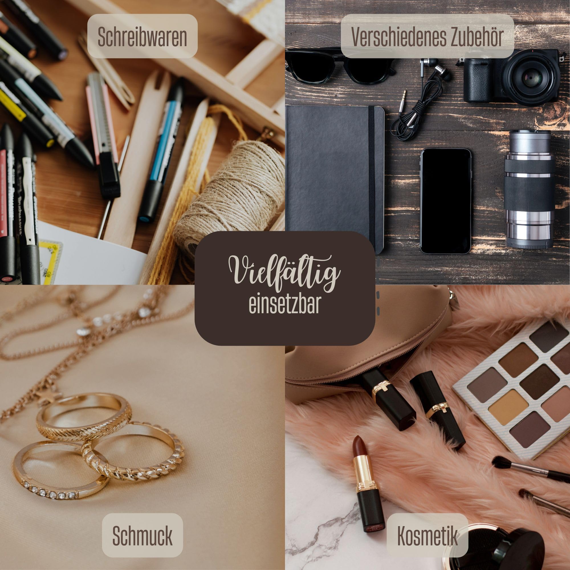 • Vielseitig einsetzbar – Ideal für die Handtasche, unterwegs auf Reisen oder als kleine Aufbewahrungslösung für Zuhause. Sie hält Make-up, Lippenstift, Bürsten und andere Kleinigkeiten sicher an ihrem Platz.