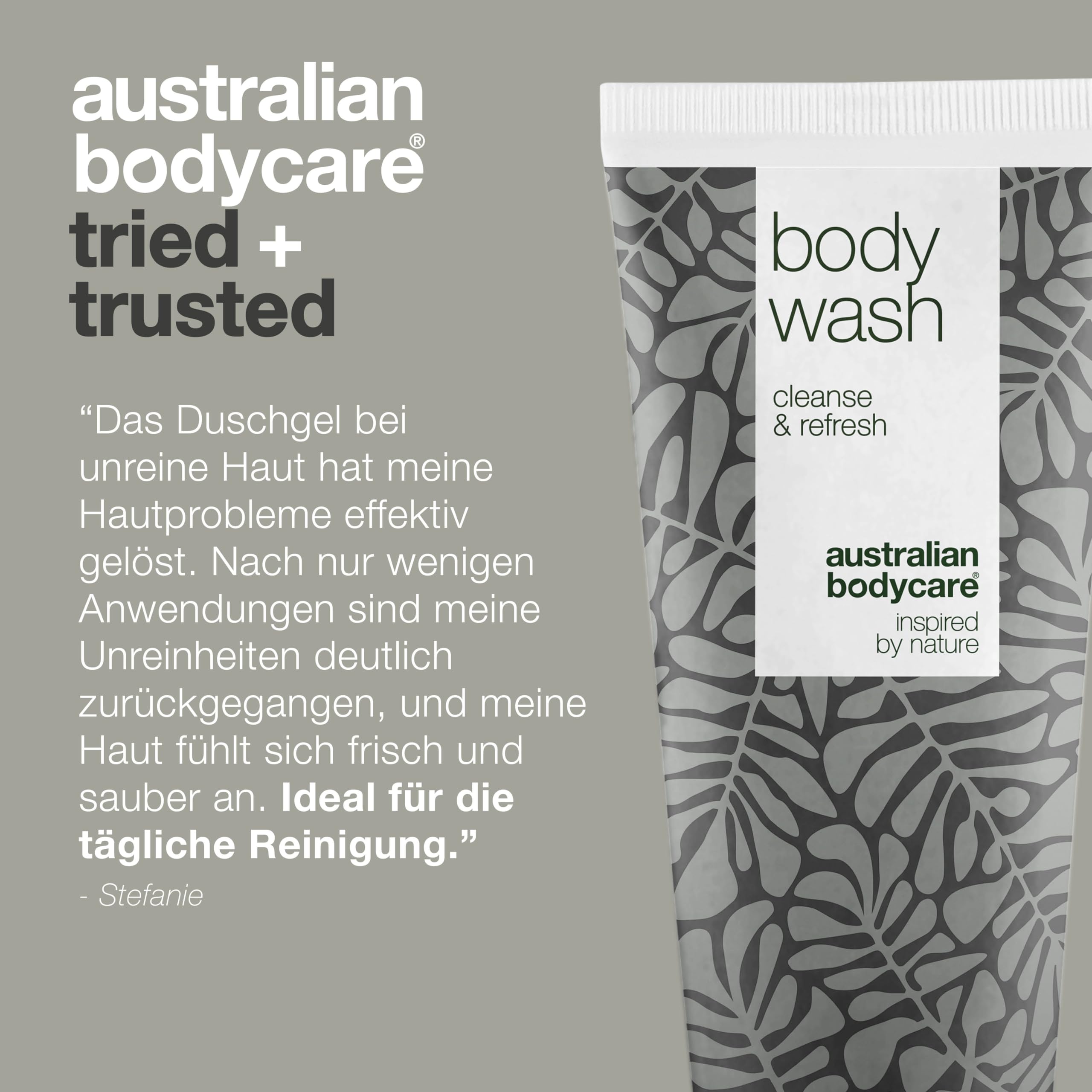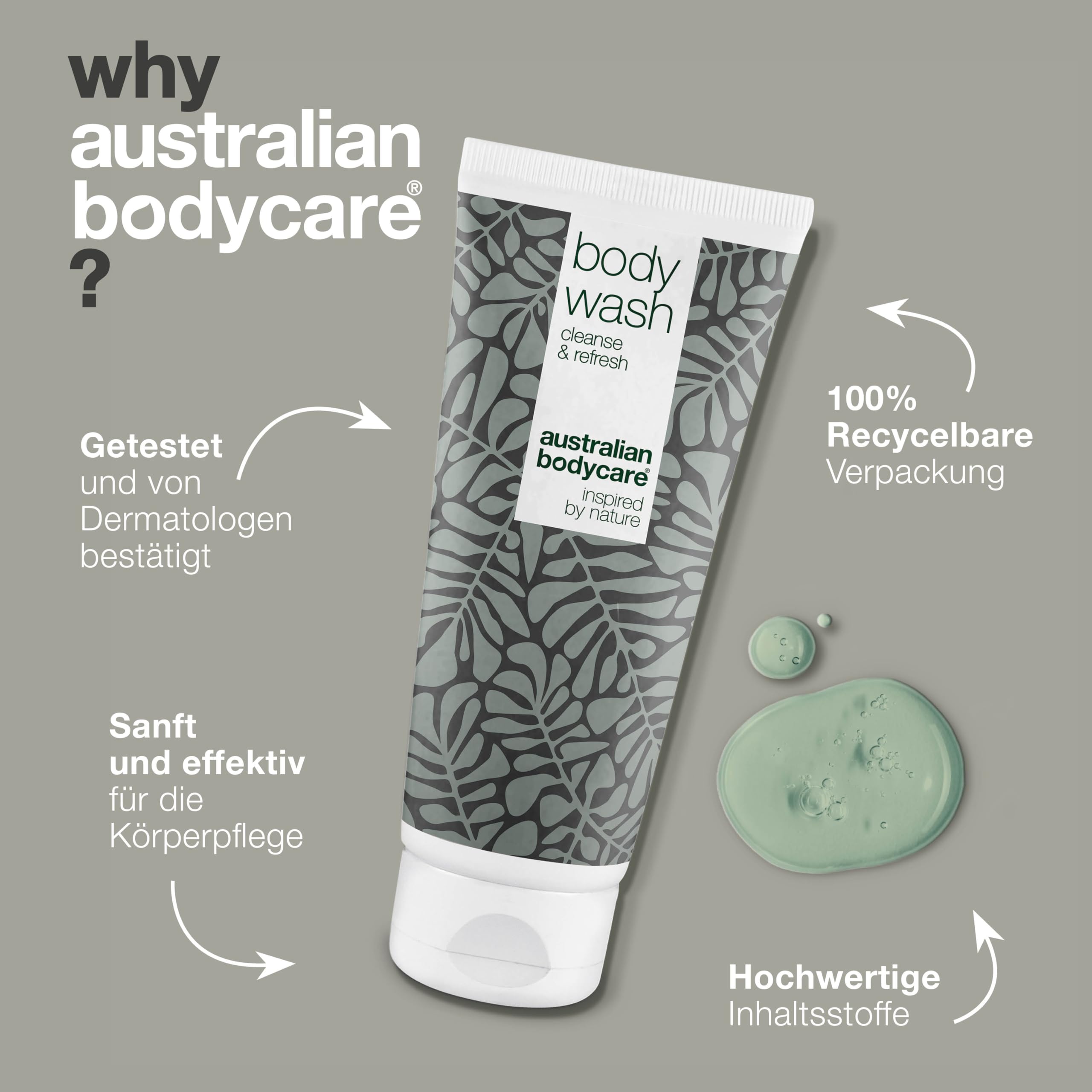 Inspiriert von der Natur und entwickelt von Hautpflegeexperten, bietet Australian Bodycare Body Wash eine wirksame, sanfte und dermatologisch getestete Lösung für gesunde, erfrischte Haut. Probieren Sie es noch heute aus und erleben Sie den Unterschied – für eine Haut, die rein, gepflegt und angenehm frisch ist.