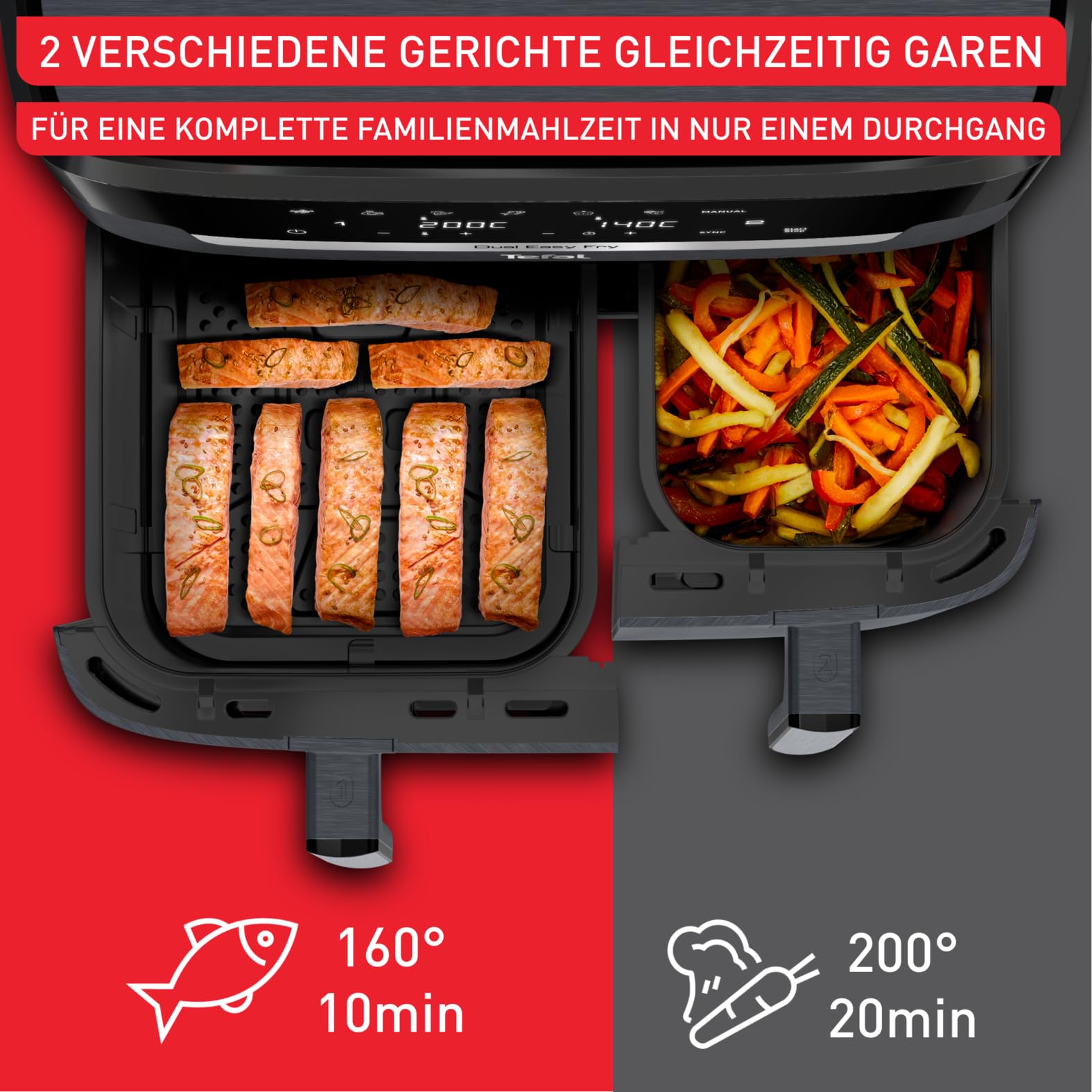 Tefal Dual Easy Fry XXL Heissluftfritteuse 11 L – Airfryer mit 2 Kammern (Doppelkammer), 7 Programme, 2700 W, digitales Display, Extra-Crisp Technologie, fettarm frittieren, energiesparend EY942B