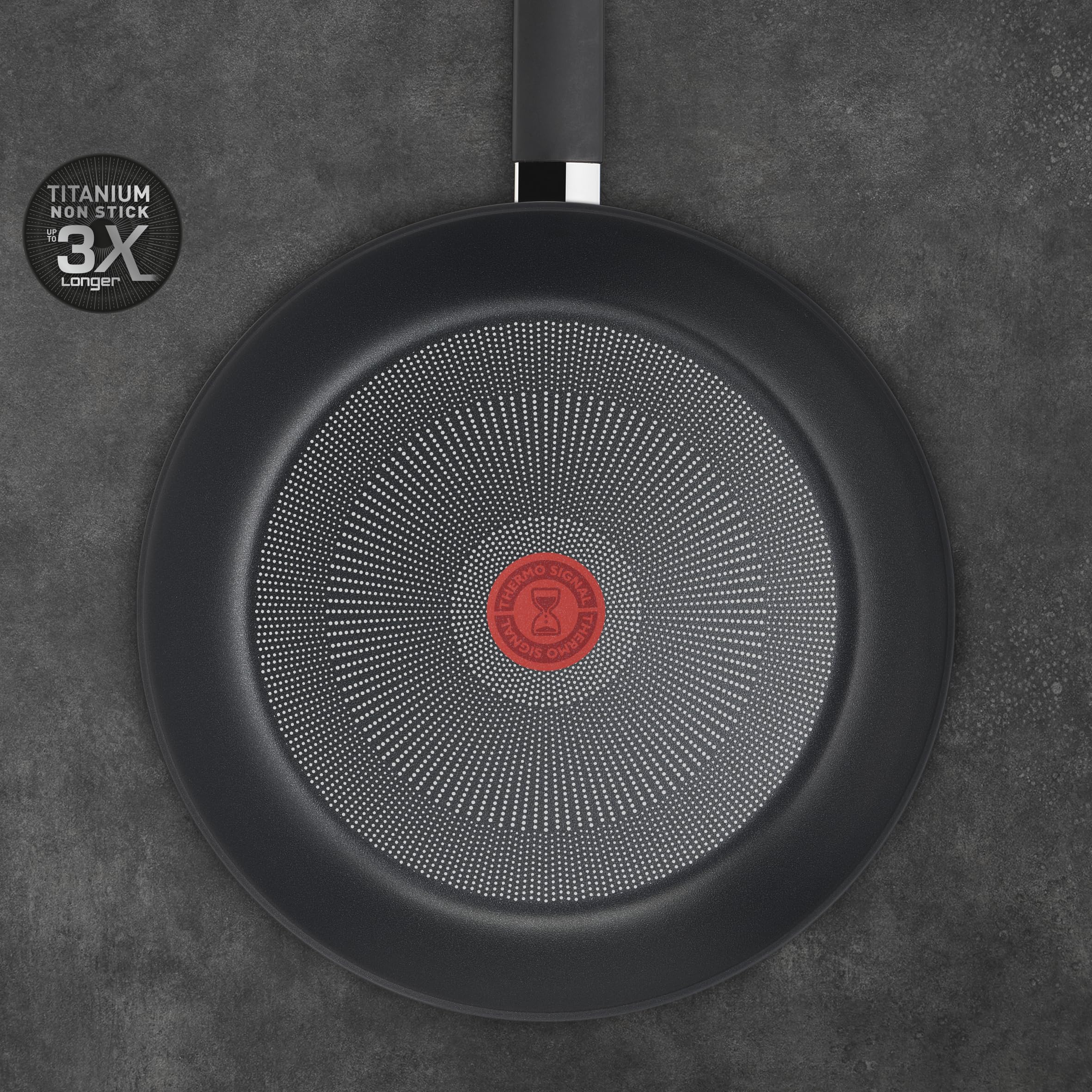 Hard Titanium On Pfannenserie: Entwickelt für eine lange Lebensdauer! Extreme Temperaturschwankungen, Küchenhelfer, scheuernde Reinigung... Kochgeschirr macht im Laufe seines Lebens eine Menge mit. Deshalb hat Tefal sein ganzes Know-how zusammengetragen, um eine Pfanne zu entwickeln, die lange hält: Hard Titanium On. Von sautiertem Gemüse über zarten Fisch bis hin zum perfekt gebratenen Steak - diese Pfanne ist ideal für eine Vielzahl von köstlichen Rezepten geeignet. Ihre Titanium 3x Antihaftversiegelung ist mit Titanpartikeln verstärkt und sorgt so für eine bis zu 3-mal längere Antihaftwirkung im Vergleich zur Tefal-Standardversiegelung. Ausgestattet mit der hochwertigen Thermo-Fusion+ Induktionstechnologie sorgt sie ausserdem für eine schnelle, gleichmässige Wärmeverteilung für gleichmässig gebratene Gerichte auf allen Herdarten. All dies wird mit der Thermo-Signal-Technologie kombiniert, welche die ideale Starttemperatur für perfektes Anbraten und geschmacksintensive Gerichte anzeigt.