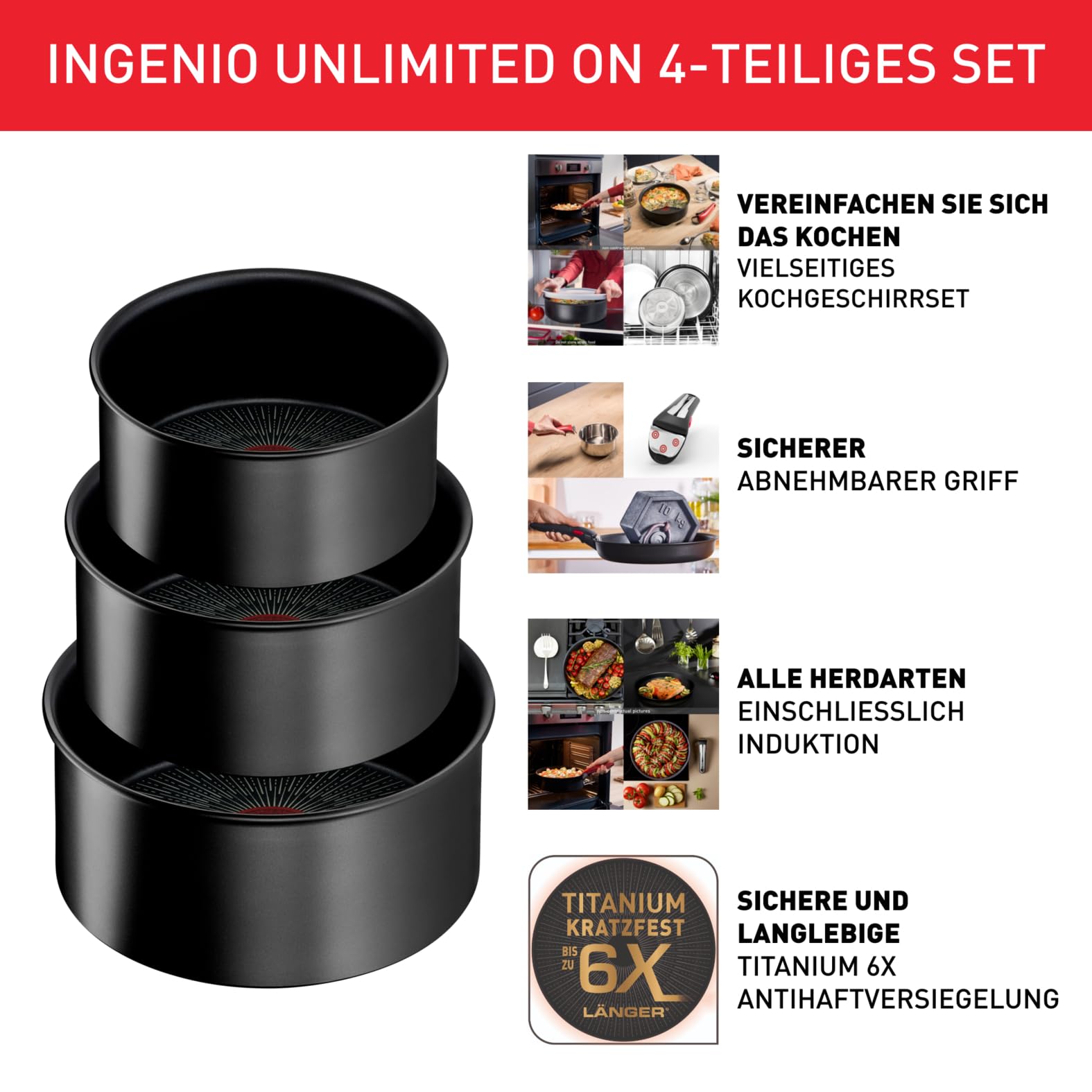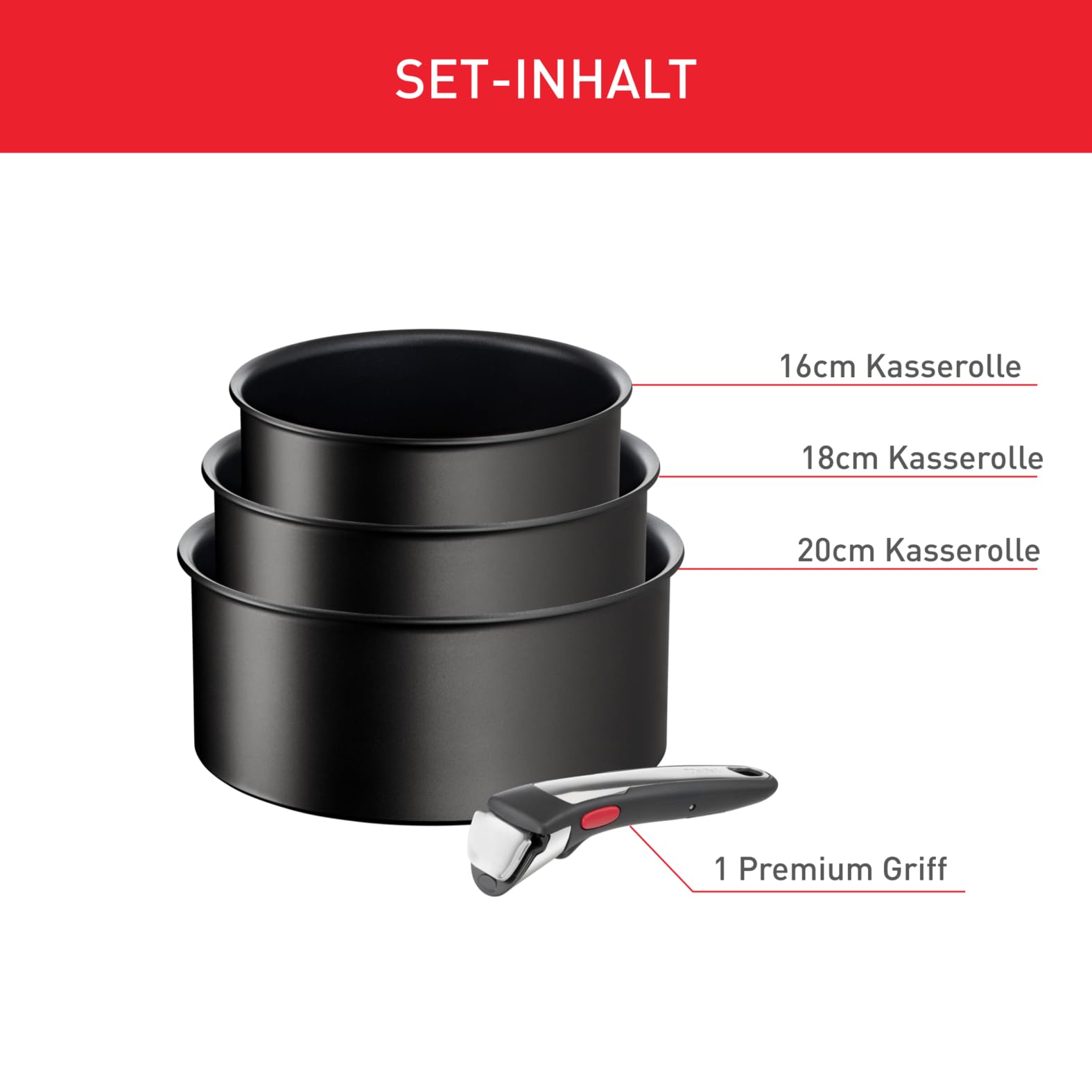 Tefal Ingenio Unlimited On 4-teiliges Kasserollenset, 16/18/20 cm, Topfset abnehmbarer Griff, stapelbar, platzsparend, Topfset Induktion antihaftversiegelt, einfache Handhabung und Reinigung, L39594