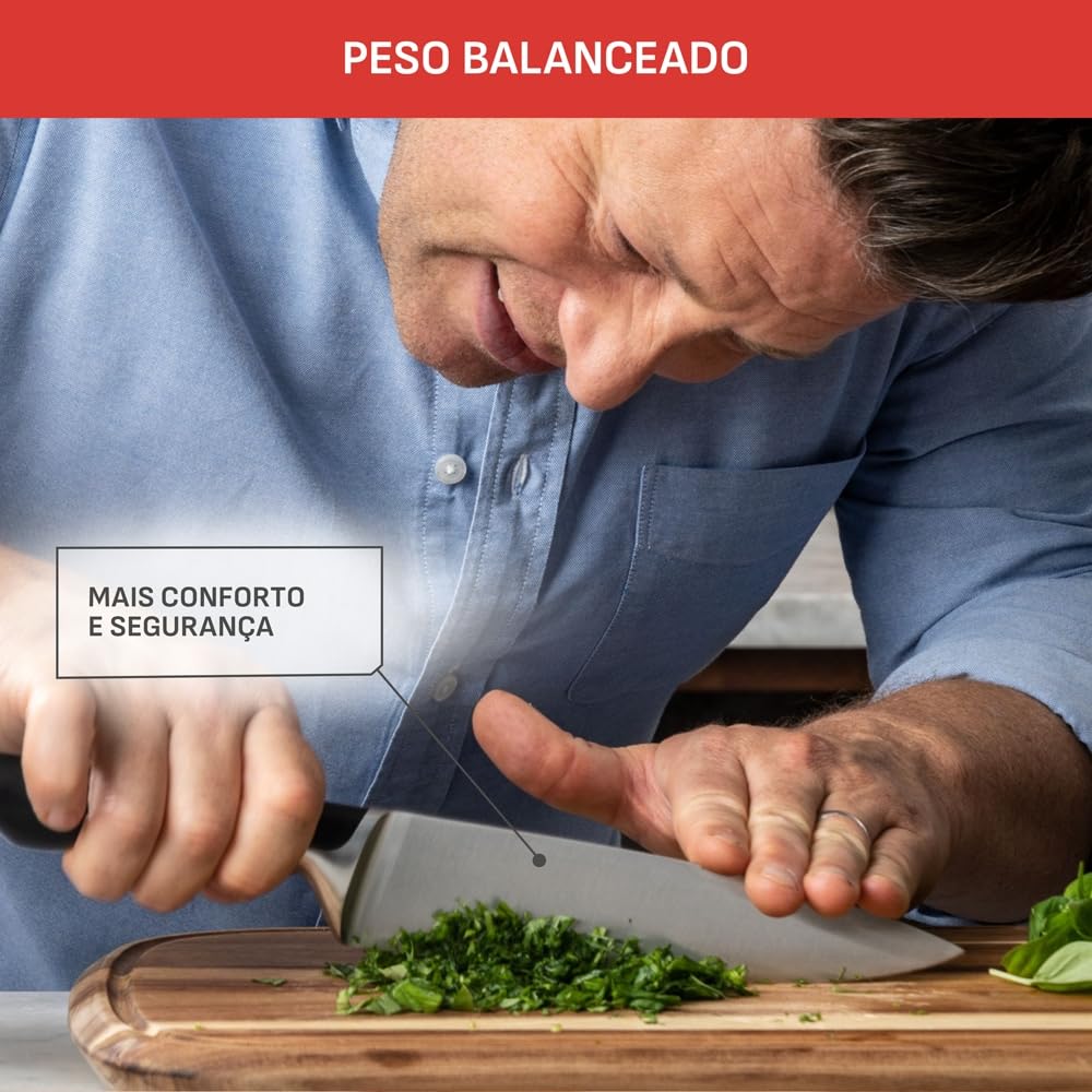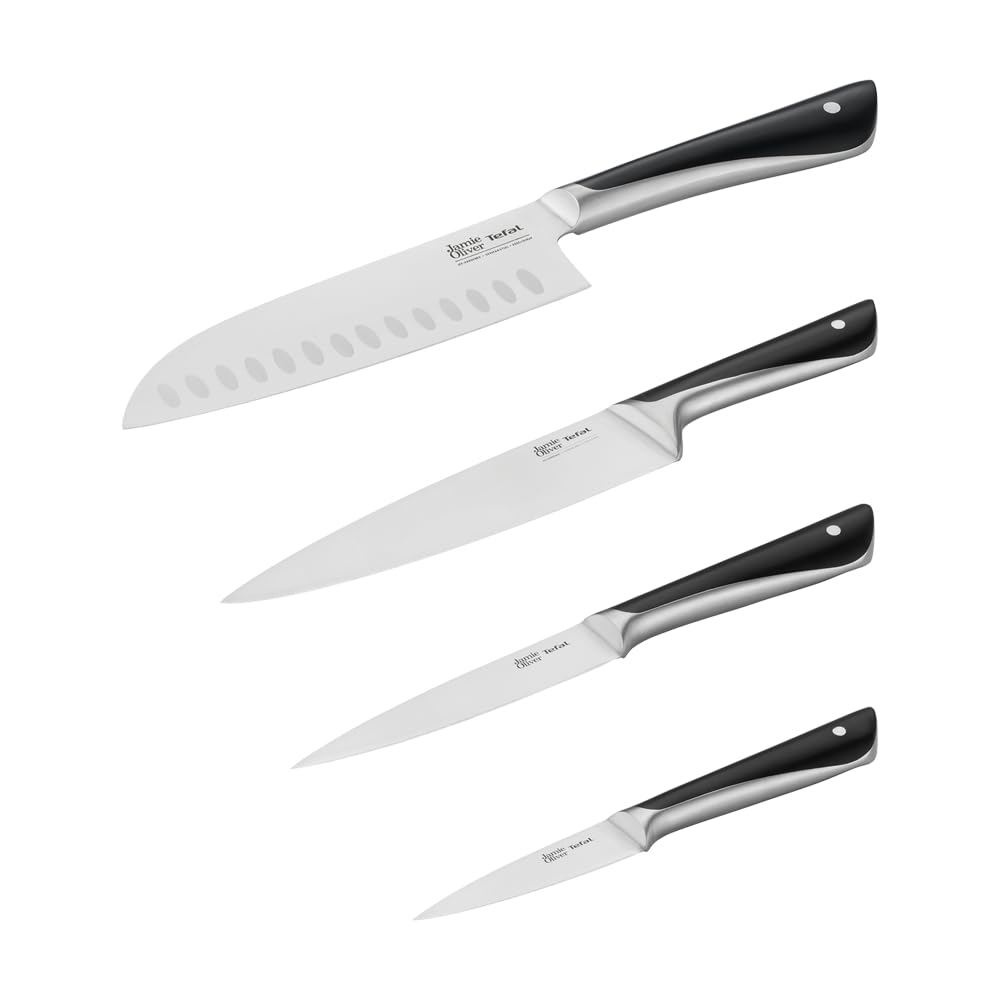 Das einzigartige 4-teilige Küchenmesser-Set von Jamie Oliver und Tefal ... das perfekte Paar in der Küche. Jamie bringt Leidenschaft und Können mit; Tefal sorgt für Technologie und Leistung. Gemeinsam stellen sie seit nahezu zwei Jahrzehnten hochwertige und bewährte Produkte her, die das Zubereiten selbstgekochter Speisen zu einer wahren Freude machen. Die intelligente Wahl für Ihre Wohlfühlkost. Eisgehärtet für eine herausragende Leistung: Die hochwertigen Klingen aus deutschem Edelstahl sind eisgehärtet. Durch einen Temperaturschock, bei dem die Temperatur von 1000°C auf -120°C gesenkt wird, gewinnen sie an Widerstandsfähigkeit und Langlebigkeit. 4-teiliges Set bestehend aus: Santokumesser 16,5 cm, Kochmesser 15 cm, Universalmesser 12 cm und Schälmesser 9 cm. "Was auch immer Sie zubereiten und kochen wollen, mit diesem fantastischen vierteiligen Küchenmesser-Set sind Sie bestens ausgestattet. Einen schönen Salat zubereiten, Chilis entkernen, frische Kräuter hacken, Lachs in dünne Streifen schneiden, hochwertiges Fleisch zerlegen, Obst schneiden und Gemüse für eine schnelle Wochenmahlzeit zerkleinern – für jede Art der Zubereitung haben Sie ein hochwertiges Messer zur Hand. Worauf warten Sie noch? Jetzt wird gekocht!" - Jamie Oliver
