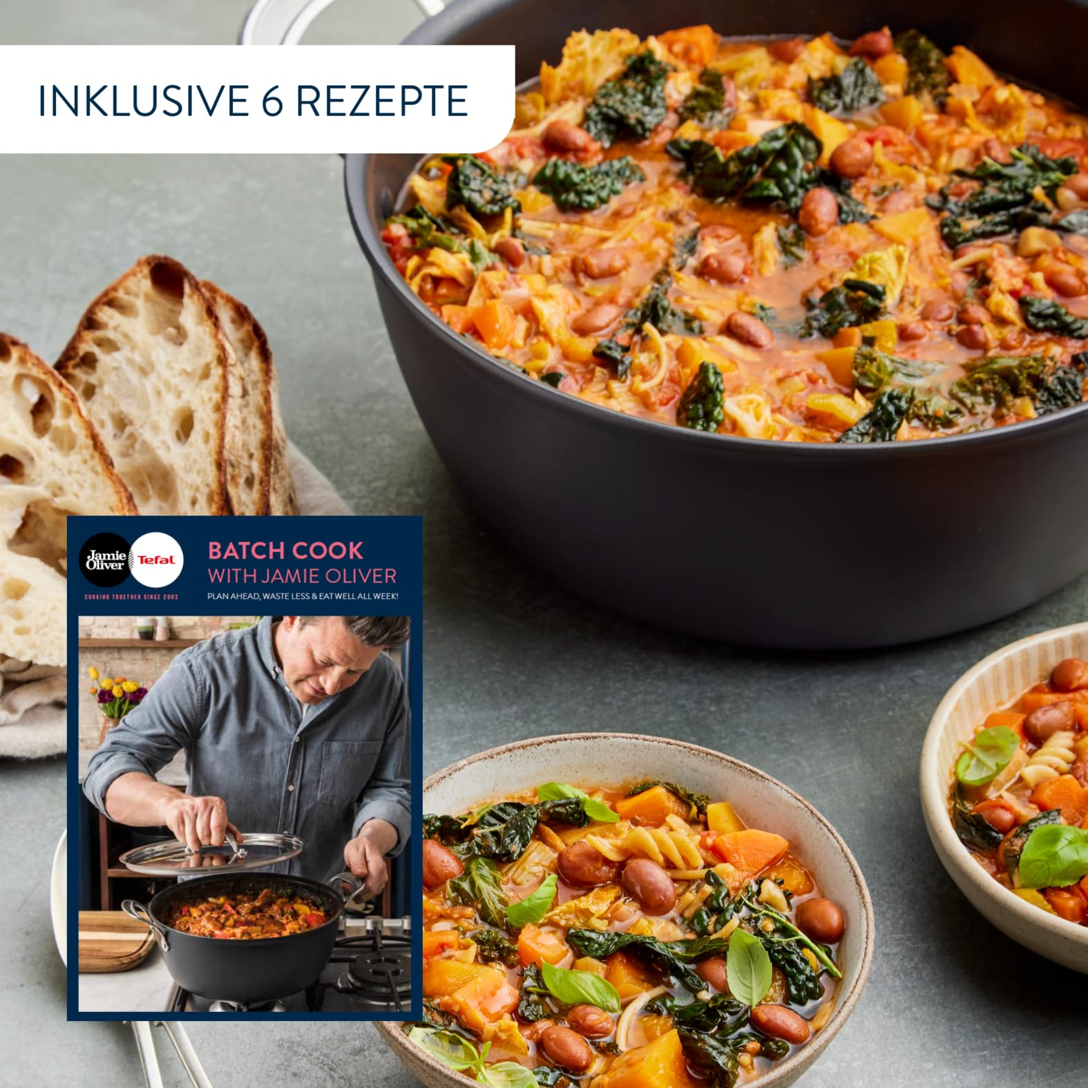 Ben je op zoek naar de perfecte kookpan voor grote garen? Plan voor, zorg voor minder afval en lekker eten-de hele week lang. De Jamie Oliver Batch Cooking Set overtuigt met zijn geborstelde afwerking en het elegante deksel van stijlvol roestvrij staal en is perfect voor het serveren rechtstreeks van het fornuis op tafel-en het resultaat smaakt net zo goed als het eruit ziet. Dankzij het grote volume van 7,4 liter kan de pan perfect worden gebruikt voor het bereiden van maaltijden voor het hele gezin. De kookpan is uitgerust met de titanium 3x anti-aanbaklaag en overtuigt met zijn bijzondere duurzaamheid. De geïntegreerde thermo-signaal temperatuurindicator kleurt uniform donkerrood, zodra de pan optimaal voorverwarmd en klaar is voor frituren, terwijl de professionele thermo-fusie Integral bodem voor een snelle en gelijkmatige warmteverdeling zorgt. Van langzaam koken tot lekkere stoofschotels of sappig gestoofd braden in de oven-met deze slimme set en het geïntegreerde receptenboekje van Jamie Oliver is het koken nog leuker. "Ik kook graag in grote hoeveelheden-dat bespaart tijd en geld. En je geniet van een smakelijke zelfgemaakte maaltijd, ook als je nog zo druk bent. Ik neem graag in het weekend een beetje tijd en geniet van het ritueel van het bereiden van grote hoeveelheden zoals bolognese, soepen, sauzen en stoofschotels, om ze als voorraad in de koelkast of vriezer op te bergen en voor een andere dag te portioneren. Heerlijke gerechten zoals zoete aardappelen, chili, kikkererwten of curry komen ook bij mij thuis altijd goed aan. Probeer het eens. Jamie Oliver Sie suchen nach dem perfekten Kochtopf für grosse Garmengen? Planen Sie vor, sorgen Sie für weniger Abfall und gutes Essen-die ganze Woche lang! Das Jamie Oliver Batch-Cooking Set überzeugt mit seinem gebürsteten Finish und dem edlen Deckel aus stylischem Edelstahl und eignet sich perfekt für ein Servieren direkt vom Herd auf den Tisch-und das Ergebnis schmeckt genauso gut, wie es aussieht! Dank seines grossen Volumens von 7,4 Liter kann der Kochopf perfekt für die Zubereitung von Mahlzeiten für die ganze Familie genutzt werden. Der Kochtopf ist mit der Titanium 3x Antihaftversiegelung ausgestattet und überzeugt mit seiner besonderen Langlebigkeit. Der integrierte Thermo-Signal Temperaturindikator färbt sich einheitlich dunkelrot, sobald der Kochtopf optimal vorgewärmt und bratbereit ist, während der professionelle Thermo-Fusion Integral Boden für eine schnelle und gleichmässige Wärmeverteilung sorgt. Von langsamen Garen über leckere Eintöpfe oder saftig geschmorten Braten im Ofen-mit diesem cleveren Set und dem integrierten Rezeptheft von Jamie Oliver macht das Kochen noch mehr Spass! "Ich koche gerne in grossen Mengen-das spart Zeit und Geld. Und man geniesst eine schmackhafte hausgemachte Mahlzeit, auch wenn man noch so beschäftigt ist. Ich nehme mir gerne am Wochenende ein bisschen Zeit und geniesse das Ritual, grosse Mengen wie Bolognese, Suppen, Saucen und Eintöpfe zuzubereiten, um sie als Vorrat in den Kühlschrank oder Gefrierfach zu lagern und für einen anderen Tag zu portionieren. Leckere Gerichte wie Süsskartoffeln, Chilli , Kichererbsen oder Curry kommen auch bei mir Zuhause immer gut an. Versuchen Sie es einmal!” Jamie Oliver Büyük pişirme miktarı için mükemmel tencere mi arıyorsunuz? Planlayın, daha az atık ve iyi yemek için tüm hafta boyunca planlayın. Jamie Oliver toplu yemek pişirme seti, fırçalanmış kaplaması ve şık paslanmaz çelikten yapılmış asil kapağı ile öne çıkar ve ocaktan masaya servis etmek için mükemmeldir-ve sonuç göründüğü kadar lezzetlidir! 7,4 litrelik büyük hacmi sayesinde tencere tüm aile için yemek hazırlamak için mükemmel şekilde kullanılabilir. Tencere titanyum 3 x yapışmaz kaplama ile donatılmıştır ve uzun ömürlülüğü ile etkileyicidir. Entegre termal sinyal sıcaklık göstergesi, tencere en iyi şekilde ısıtıldığında ve kızartmaya hazır olduğunda eşit olarak koyu kırmızı renkte olur, profesyonel Thermo-Fusion Integral taban hızlı ve eşit ısı dağılımı sağlar. Yavaş pişirmekten lezzetli güveçlere veya fırında sulu haşlanmış kızartmalara-bu akıllı set ve Jamie Oliver tarifi kitabı ile yemek pişirmek daha eğlenceli hale gelir! "Büyük miktarlarda yemek yapmayı seviyorum-bu zaman ve para tasarrufu sağlar. Ve çok meşgul olsanız bile lezzetli bir ev yapımı yemeğin tadını çıkarın. Hafta sonları biraz zaman ayırmayı seviyorum ve bolognese, çorba, soslar ve güveç gibi büyük miktarlarda hazırlamanın ritüelinin tadını çıkarıyorum, bunları buzdolabında veya dondurucuda saklamak ve başka bir gün için porsiyonlar yapmak için. Tatlı patates, biber, nohut veya köri gibi lezzetli yemekler evime her zaman iyi gelir. Bir kez deneyin! " Jamie Oliver Hledáte perfektní hrnec na vaření pro velké množství? Plánujte předem, zajistěte méně odpadu a dobrého jídla-po celý týden. Sada dávkových vaření Jamie Oliver přesvědčí svým kartáčovaným povrchem a ušlechtilým víkem ze stylové ušlechtilé oceli a perfektně se hodí pro servírování přímo ze sporáku na stůl-a výsledek chutná stejně dobře, jak vypadá! Díky svému velkému objemu 7,4 litru lze hrnec perfektně použít pro přípravu jídel pro celou rodinu. Hrnec na vaření je vybaven nepřilnavým povrchem Titanium 3x a přesvědčí svou mimořádnou životností. Integrovaný tepelný signál indikátor teploty se jednoznačně zabarví tmavě červeně, jakmile je hrnec optimálně předehřátý a připraven k smažení, zatímco profesionální termofusion Integral dno zajišťuje rychlé a rovnoměrné rozložení tepla. Od pomalého vaření přes chutné dušené pokrmy nebo šťavnaté dušené pečení v troubě-s touto chytrou sadou a integrovaným sešitem receptů od Jamie Oliver je vaření ještě zábavnější! "Rád vařím ve velkém množstv