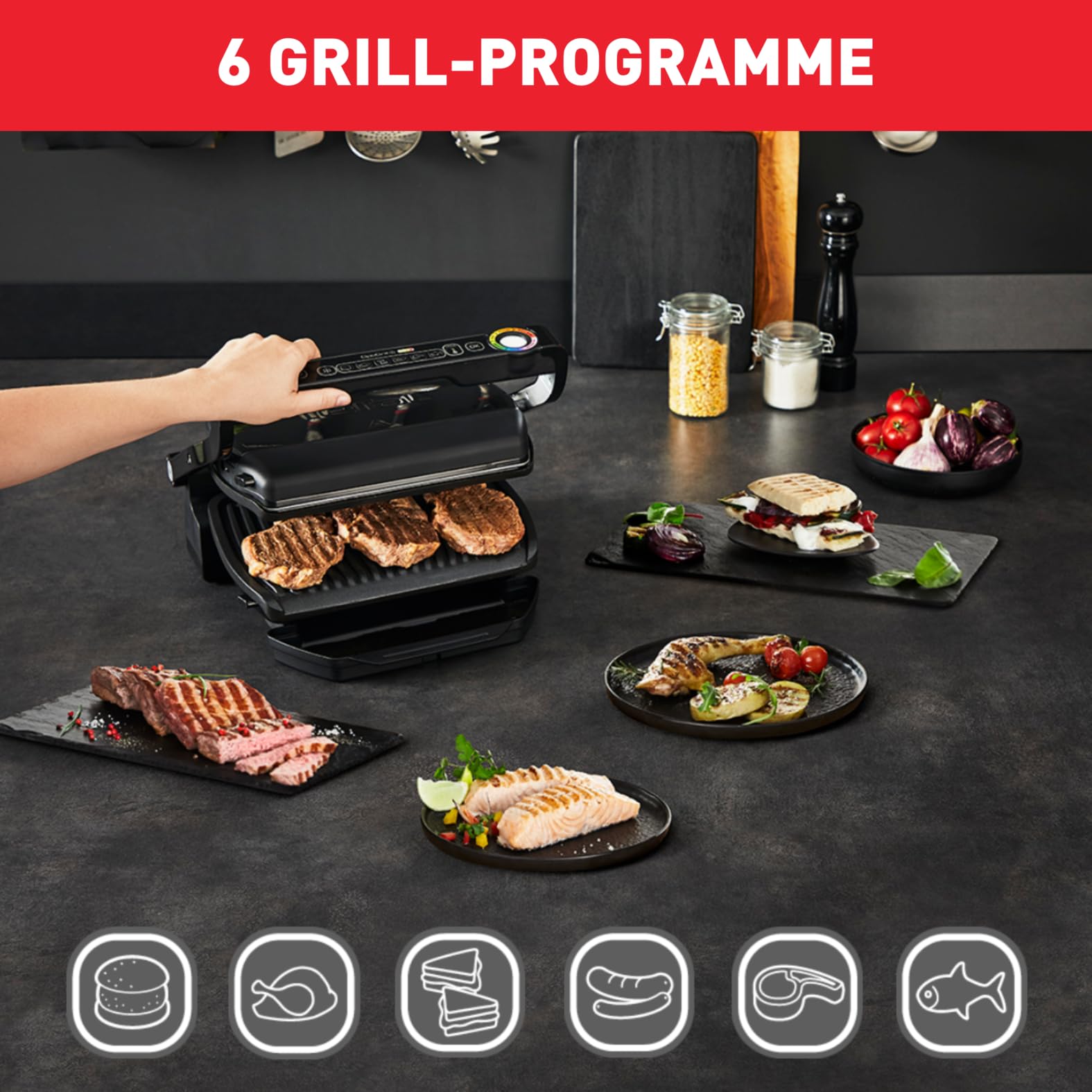 Tefal OptiGrill Kontaktgrill, 6 automatische Programme, Garstufenanzeige, passt Temperatur und Grillzyklus ans Grillgut an, abnehmbare Platten, manueller Modus, Elektrogrill, schwarz, GC705816