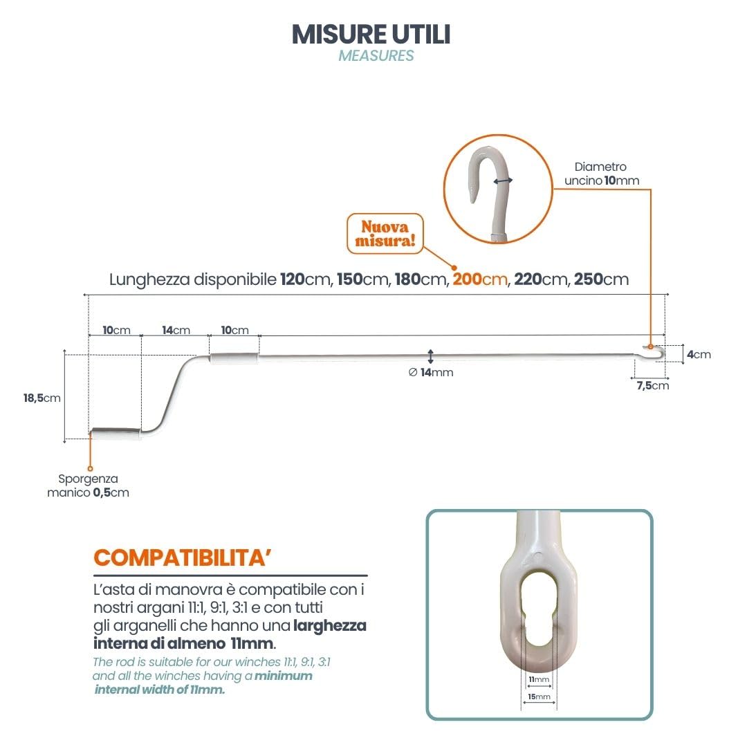 TENDAGGIMANIA Markisenkurbel Farbe GRAU - Grösse 200 CM - Markisenkurbel mit Haken Universal aus lackiertem Eisen mit ergonomischem Griff aus PVC - Kurbelstange für Markise