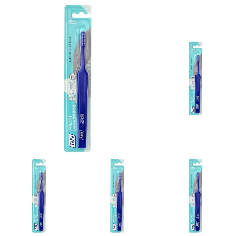 TEPE Spezial-Zahnbürste Implantat Orthodontic mit extra schmalem Bürstenkopf - für Zahnspangen & zur Implantat Reinigung hergestellt / 1 x 1 Stück, Farblich sortiert, 1stk (Packung mit 5)