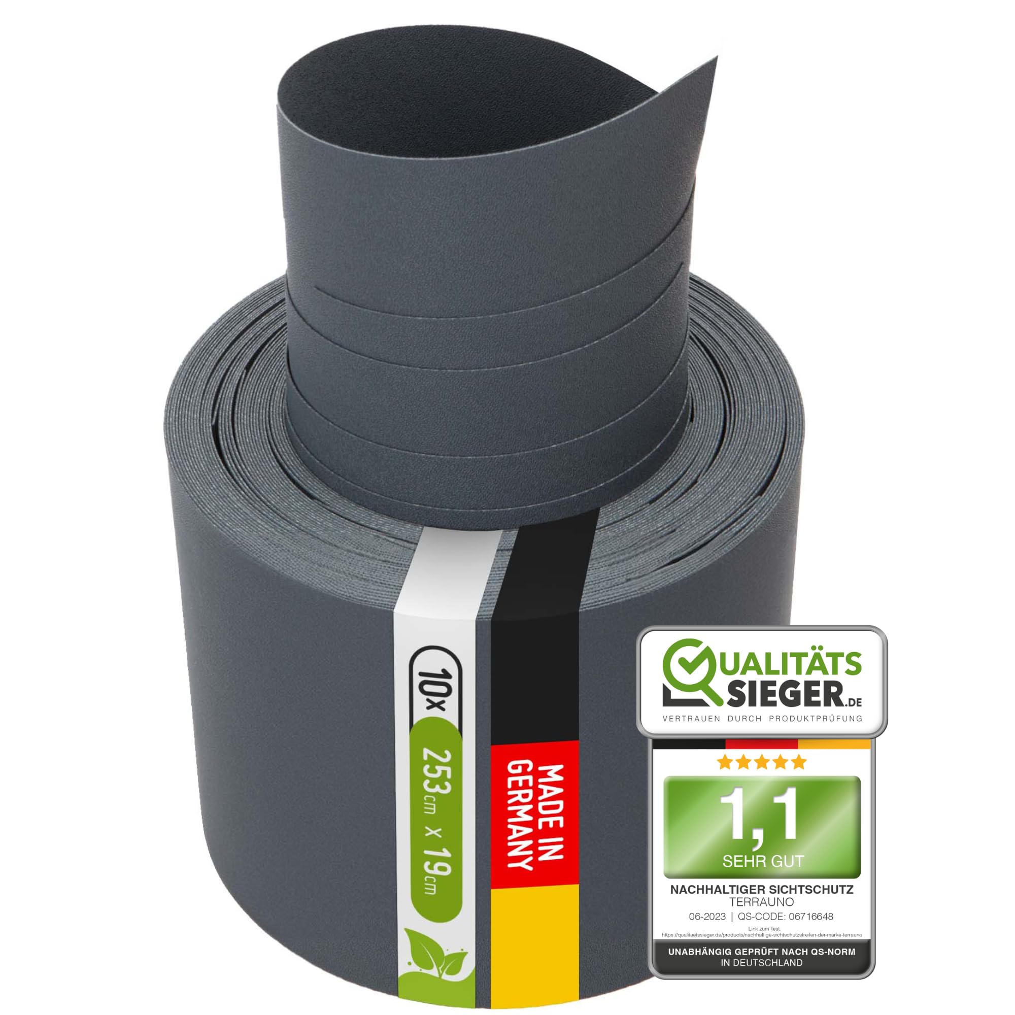 TerraUno Nachhaltige Sichtschutzstreifen für Doppelstabmatten, Polypropylen, Made in Germany, RAL 7016 Anthrazit, 10 Streifen, extra stabil, Lederoptik, Zaun Sichtschutz mit UV-Beständigkeit