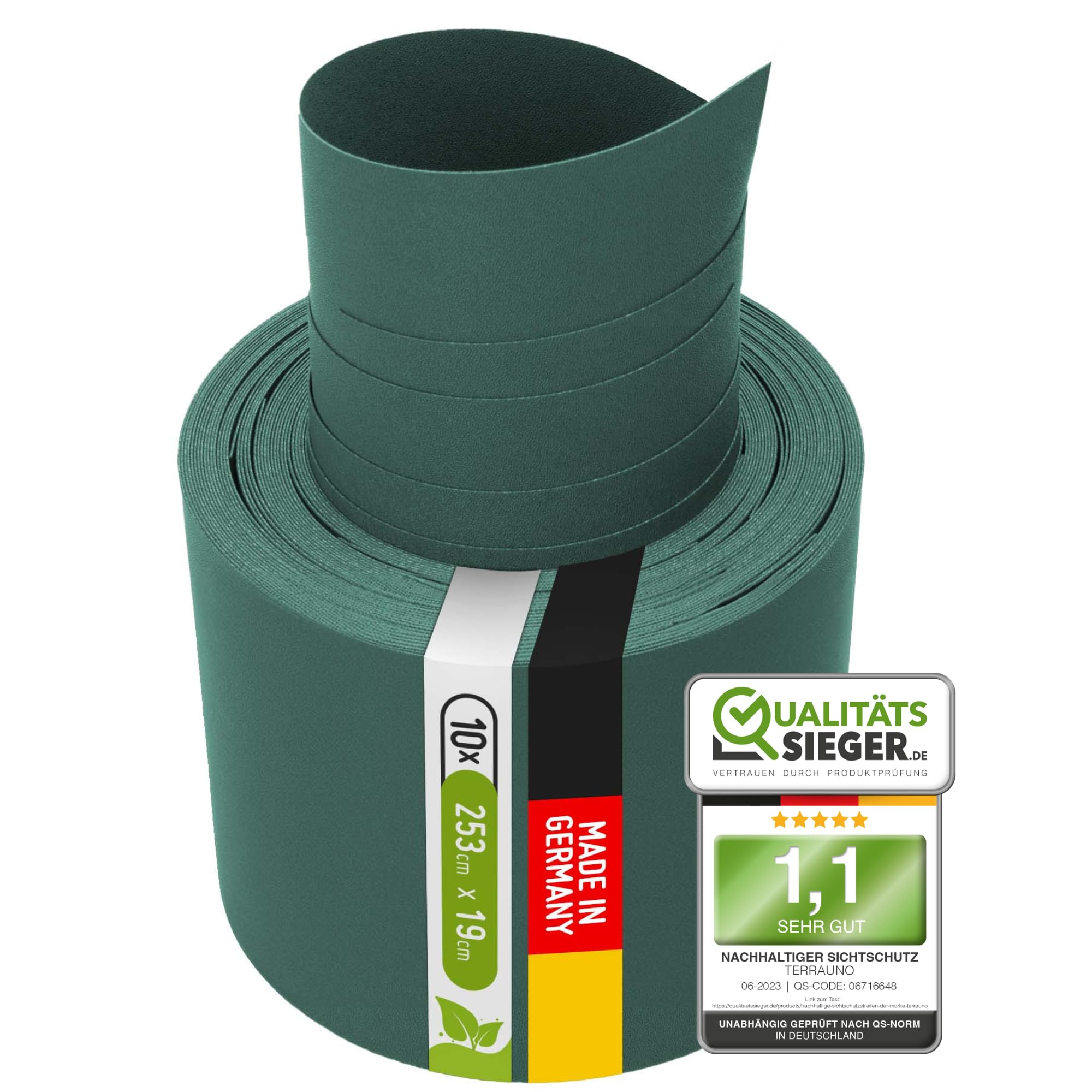 TerraUno Nachhaltige Sichtschutzstreifen für Doppelstabmatten, Polypropylen, Made in Germany, RAL 6005 Grün, 10 Streifen, extra stabil, Lederoptik, Zaun Sichtschutz mit UV-Beständigkeit