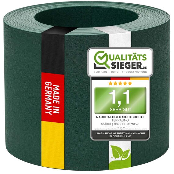TerraUno Nachhaltige Sichtschutzstreifen für Doppelstabmatten, Polypropylen, Made in Germany, RAL 6005 Grün, 26m x19cm Rolle, extra stabil, Lederoptik, Zaun Sichtschutz mit UV-Beständigkeit