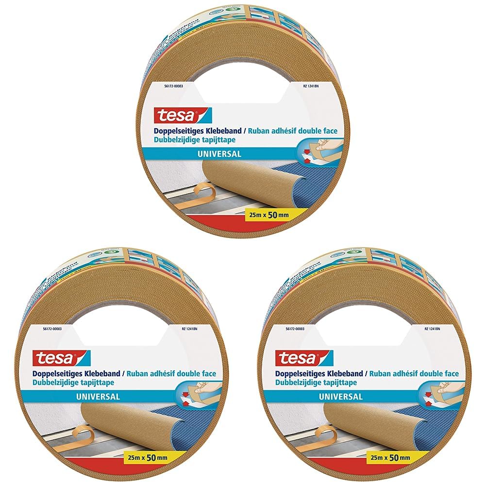 tesa Doppelseitiges Klebeband Universal - Vielseitiges Klebeband für Verpackungen, Deko und Teppiche oder zum Basteln - 25 m x 50 mm (Packung mit 3)