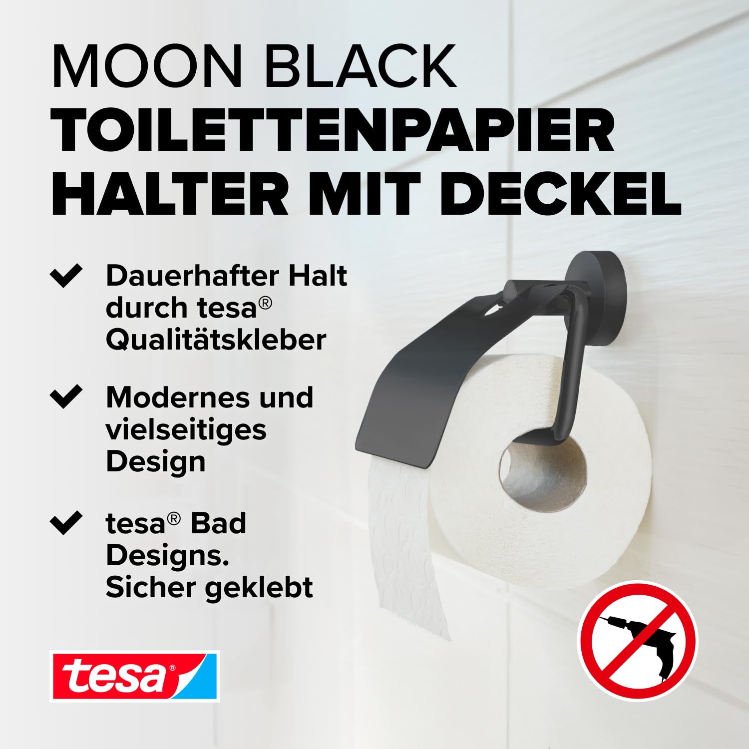 tesa Moon Black Toilettenpapierhalter mit Deckel, matt schwarz - WC-Rollenhalter zur Wandbefestigung ohne Bohren, inkl. Klebelösung - 53 mm x 140 mm x 128 mm