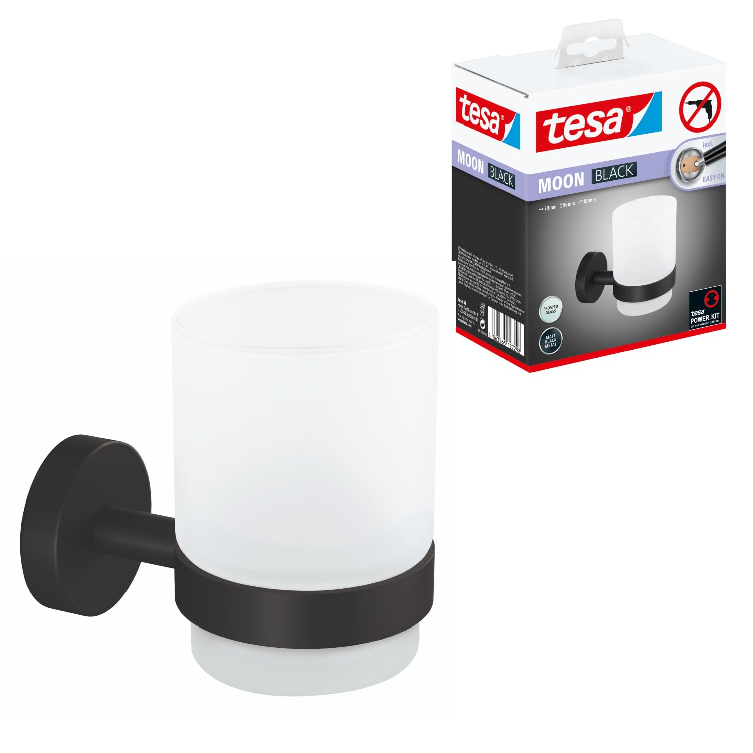 tesa Moon Black Zahnputzbecher aus satiniertem Glas mit Halter, matt schwarz - für Bäder im Industrial Style und Moderne Badezimmer - bohrfrei, inkl. Klebelösung - 70 mm x 96 mm x 109 mm