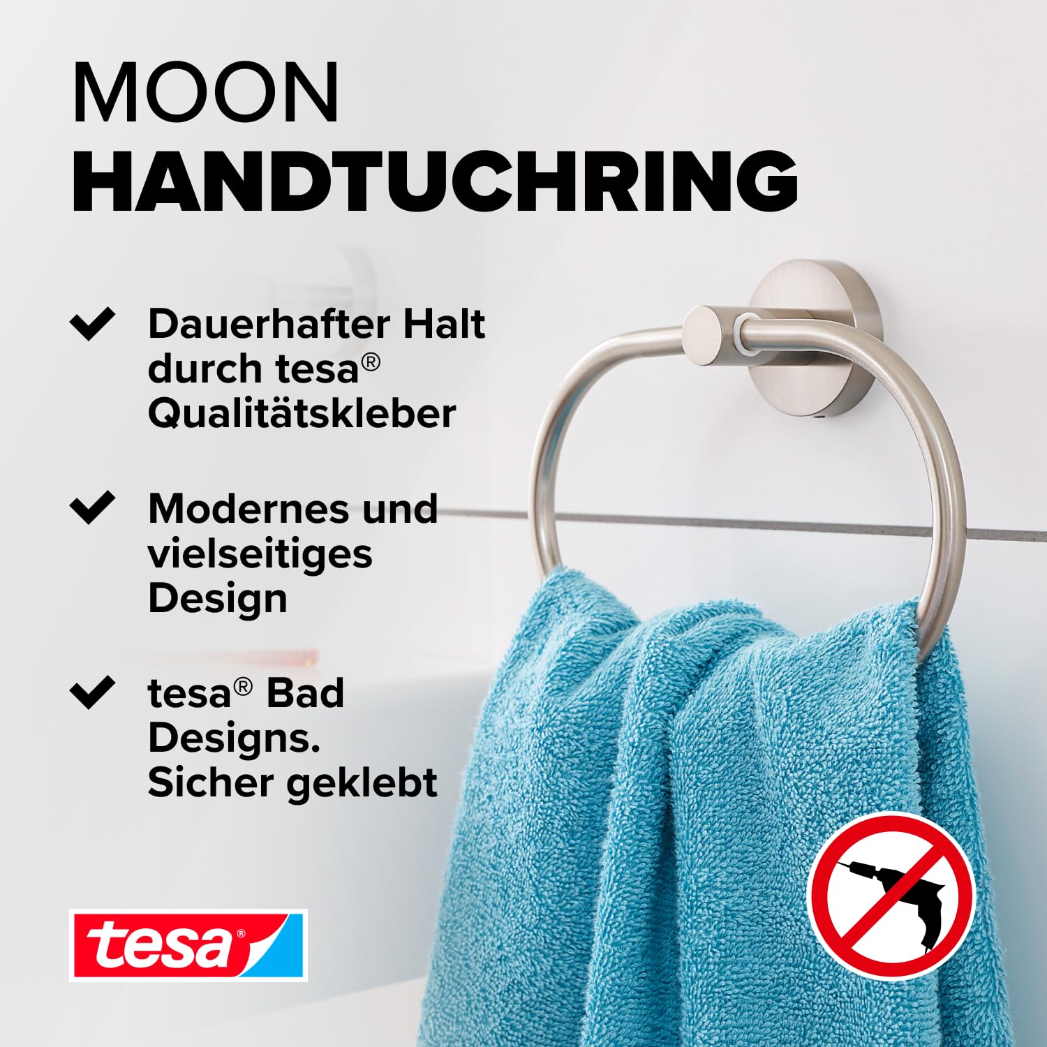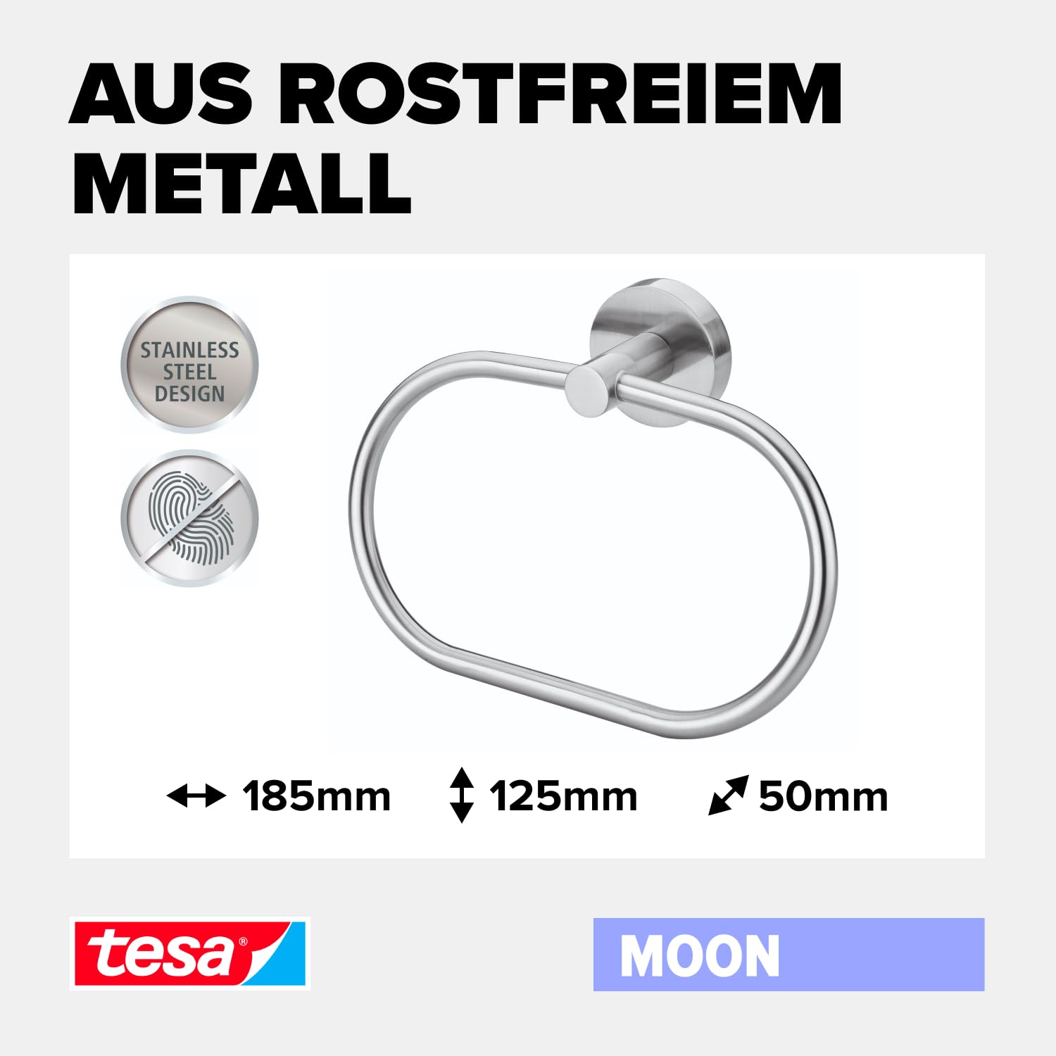 tesa Moon Handtuchring, Edelstahloptik - Handtuchhalter-Ring oval - zur Wandbefestigung ohne Bohren, inkl. Klebelösung - 185mm x 125mm x 50mm
