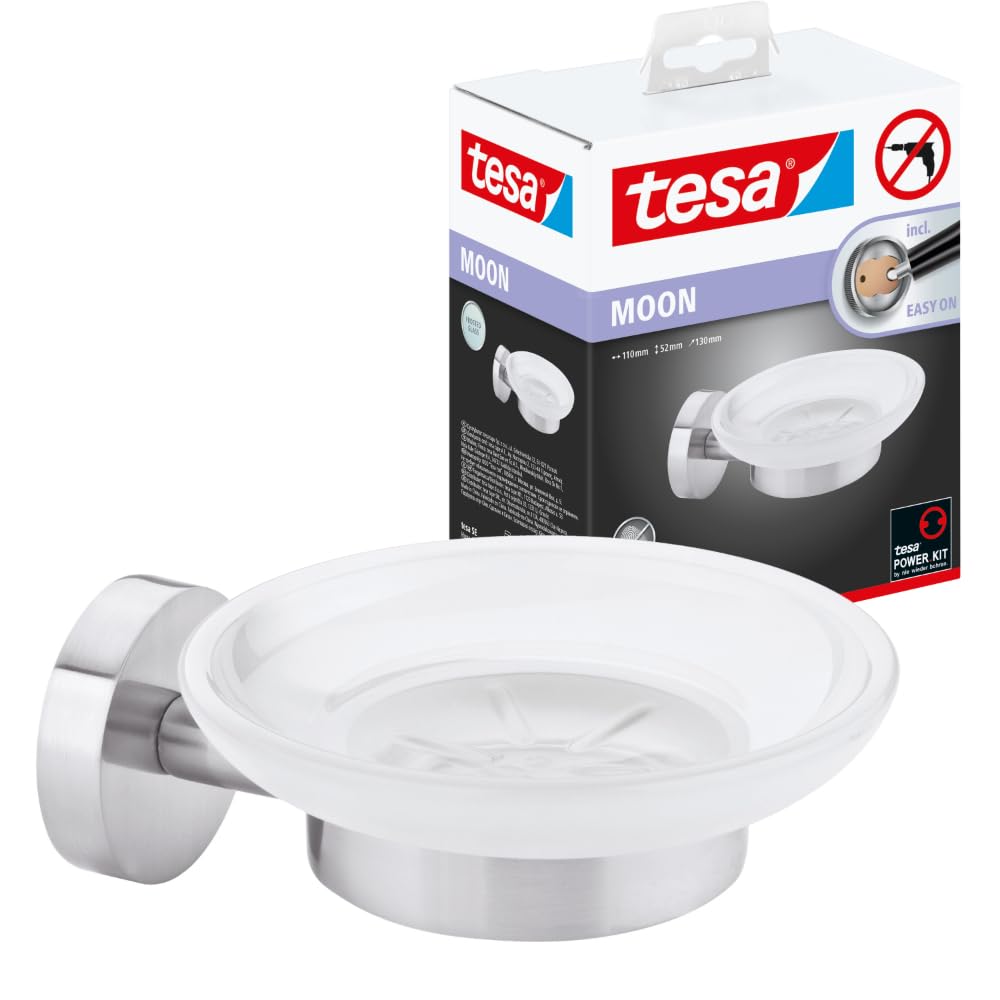 tesa Moon Seifenschale mit Wandhalterung, satiniertem Glas und verchromtem Edelstahl - zur Wandbefestigung ohne Bohren, inkl. Klebelösung - 110mm x 52mm x 130mm