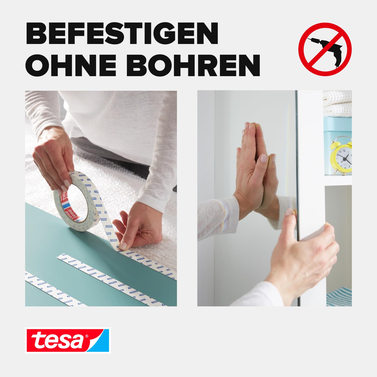 tesa Powerbond MIRROR Ein verlässlich befestigter Spiegel gehört zur Grundausstattung eines jeden Badezimmers. Doch nicht immer ist dessen Montage unkompliziert. Lautes Bohren stört nicht nur die Nachbarn, sondern hinterlässt auch unschöne Löcher in der Wand und auf Fliesen. Mit tesa Powerbond MIRROR gehört diese Methode der Befestigung nun der Vergangenheit an. Das starke, doppelseitige Klebeband von tesa fixiert Spiegel zuverlässig und ganz ohne Bohren. Feuchtigkeitsbeständig und flexibel zuschneidbar, ist es ein unverzichtbares Hilfsmittel für die Montage von Spiegeln im Innenbereich. Empfehlung: Ideal für alle, die Spiegel und andere flache Gegenstände in Feuchträumen sicher befestigen möchten Das Wichtigste auf einen Blick: ✔ Die saubere Klebelösung für Spiegel ✔ Starke Klebekraft auf beiden Seiten ✔ Feuchtigkeitsbeständig und somit für das Bad geeignet ✔ Individuell zuschneidbar Angaben zum Produkt: Lieferumfang: 1 x tesa Powerbond MIRROR Masse: 1,5 m x 19 mm tesa - mehr als ein Klebeband tesa gehört zu den weltweit führenden Herstellern von Klebebändern und Klebesystemlösungen und steht für innovative und qualitativ hochwertige Produkte. Seit über 125 Jahren entwickelt das deutsche Unternehmen Lösungen für vielfältige Anwendungen für Büro, Haus und Garten aber auch für die Automobil- und Elektronikindustrie. Privaten Haushalten bietet tesa mehrere hundert Lösungen im Umfeld innovatives Befestigen, Montieren, Verpacken, Renovieren, Reparieren, Isolieren oder beim Schutz vor Insekten, Staub und Zugluft.