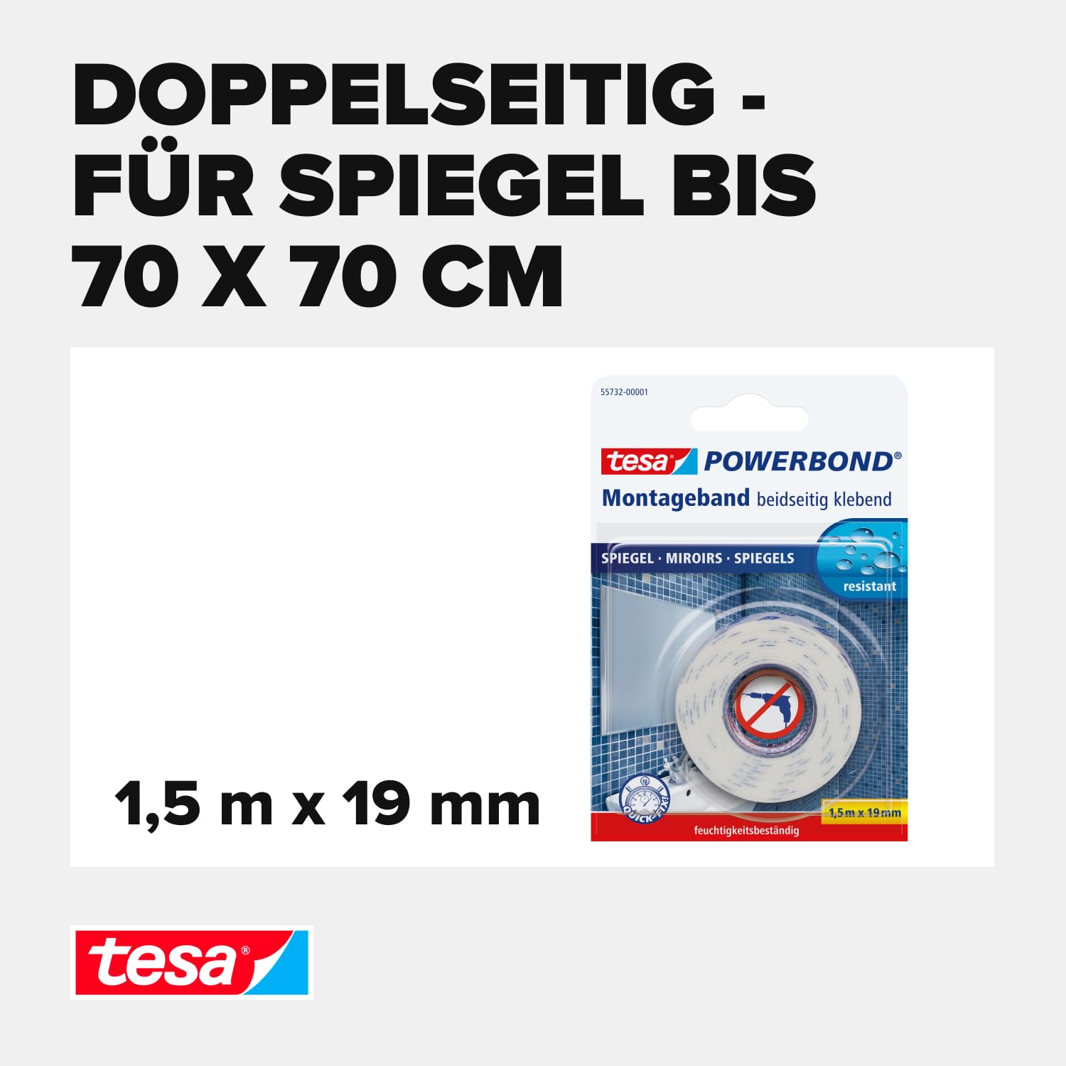 tesa Powerbond MIRROR - Doppelseitiges Montageband zur Fixierung von Spiegeln - Feuchtigkeitsbeständiges Klebeband für Bad und Dusche - 1,5 m x 19 mm